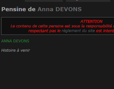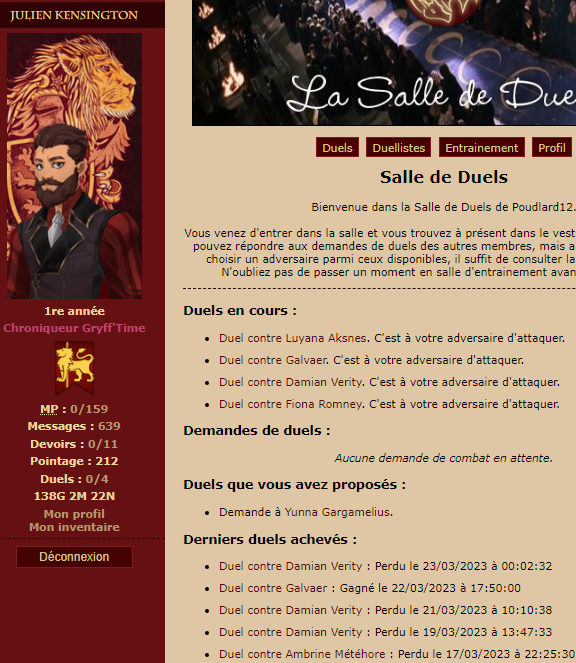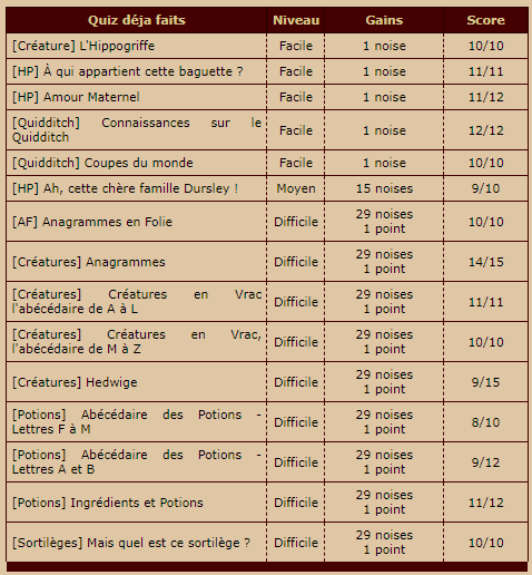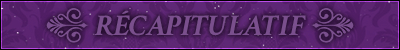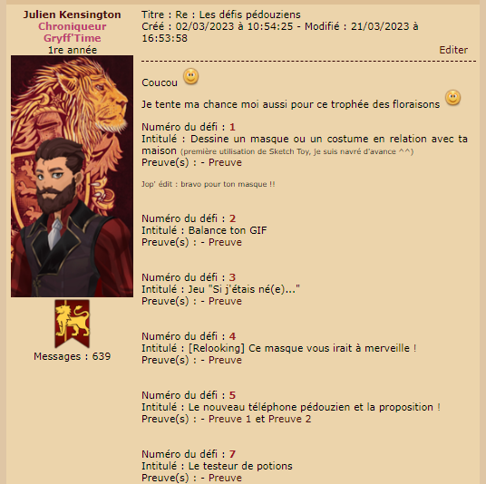---------------------------------- ------------------------ J'éditerai au fur et à mesure pour les preuves et je les mettrai aux couleurs de Gryffondor quand je les ajouterai Mary edit : Je t'ai ajouté au récapitulatif et félicitations, tu as tout validé ! |