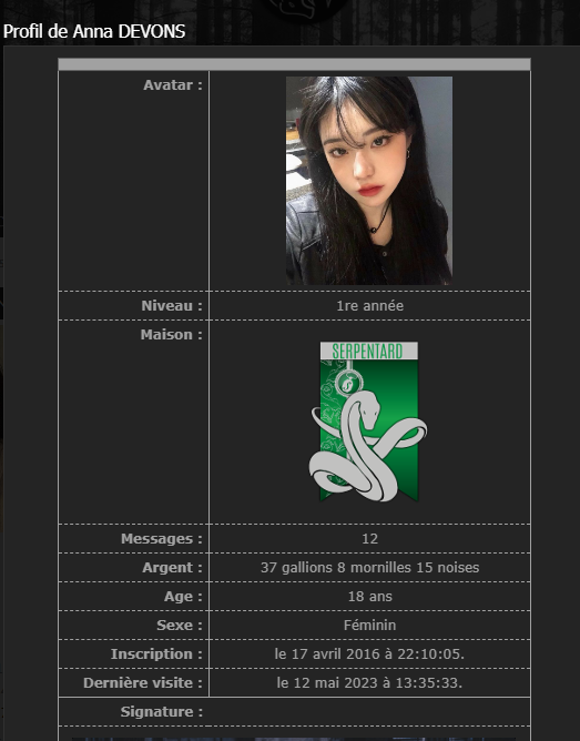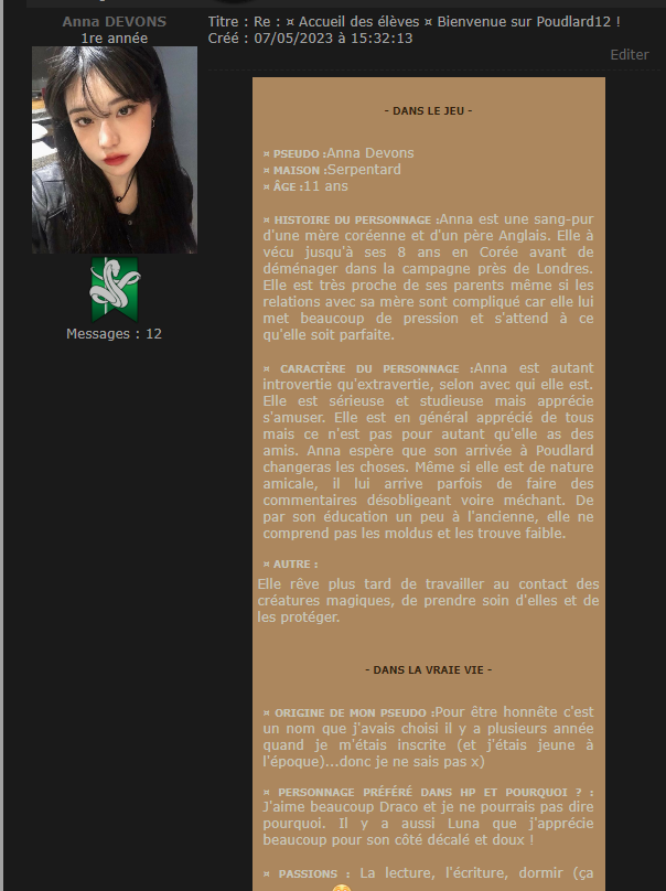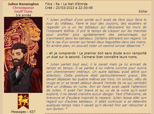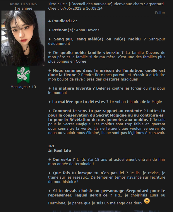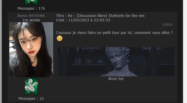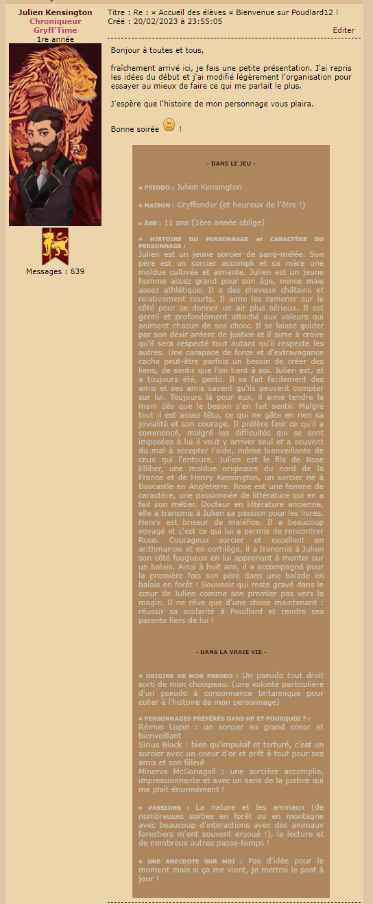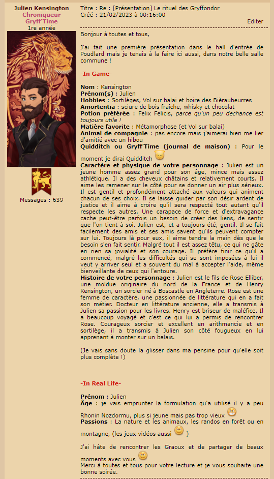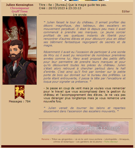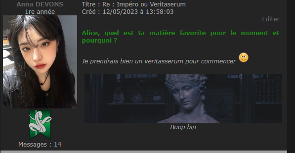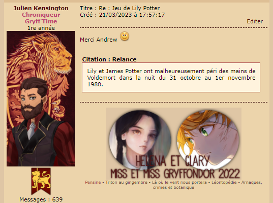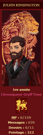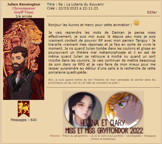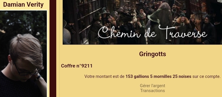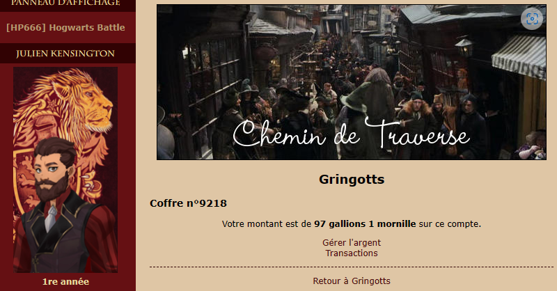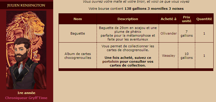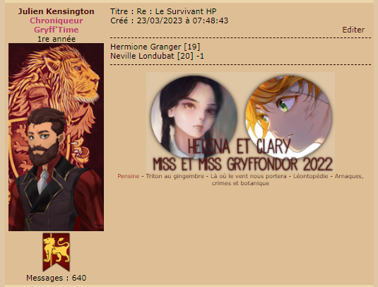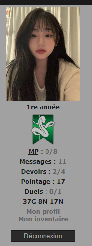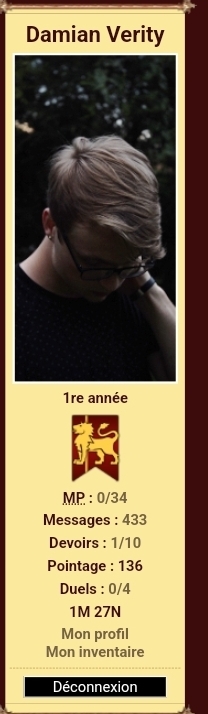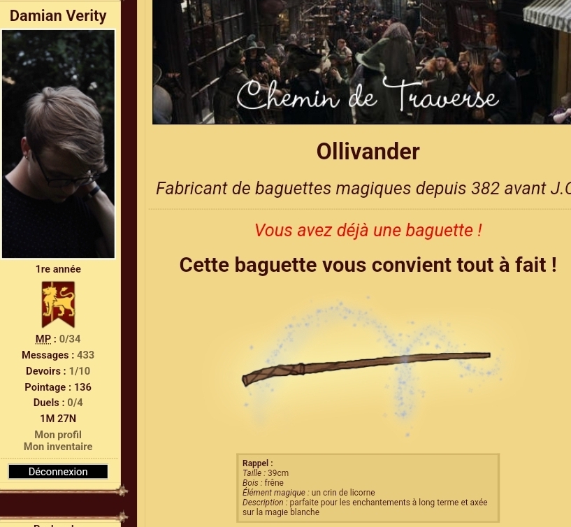 Revêtir des vêtements neufs : changer son avatar. Si besoin, se rendre dans une des boutiques 5 pts Preuve : Lien de l'image Ouvrir un compte à Gringotts 5 pts Preuve : Lien de l'image Acheter une baguette magique 5 pts Preuve : Lien de l'image Créer sa pensine 5 pts Preuve : Lien de ma pensine Edit de Mary : Coucou ! Ne t'inquiète pas, tu peux toujours éditer ton post pour rajouter de nouvelles preuves. Je t'informe juste que tu trouveras un suivi de la validation de tes défis ici. Je ne modifierai pas directement ton post pour noter les défis validés, je modifierai juste ce récapitulatif. :3 ![]() Découvrir le Hall d'Entrée : Se présenter dans le topic d’accueil aux autres élèves du château 5 pts Preuve : Poster un message dans le bureau des Préfètes-en-Chef 5 pts Preuve : Se rendre dans le lieu RPG « Le Hall d'entrée » et écrire un petit RPG 10 pts Preuve : Participer à une Soirée de Miry 10 pts Preuve : ![]() ![]() |