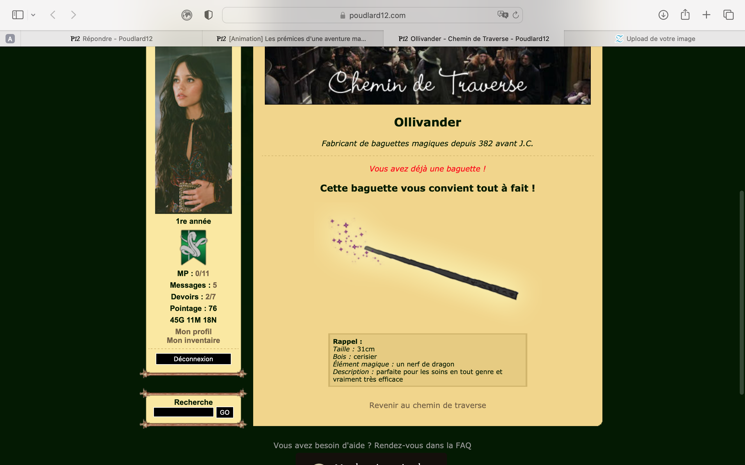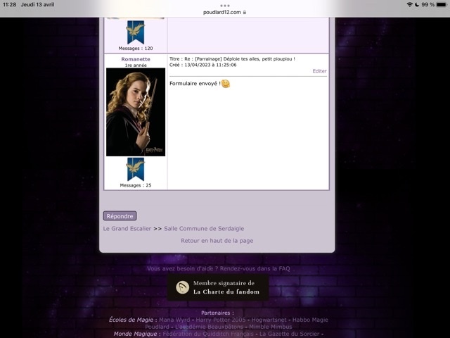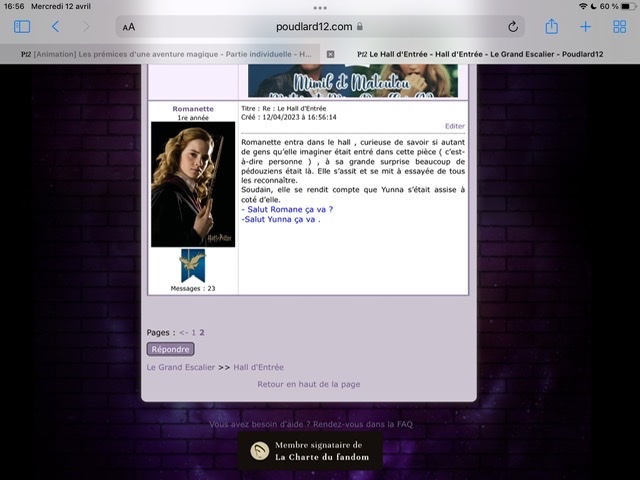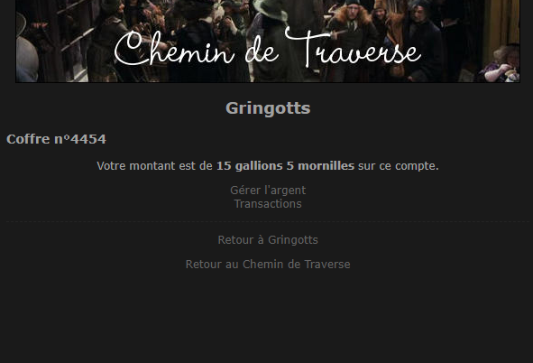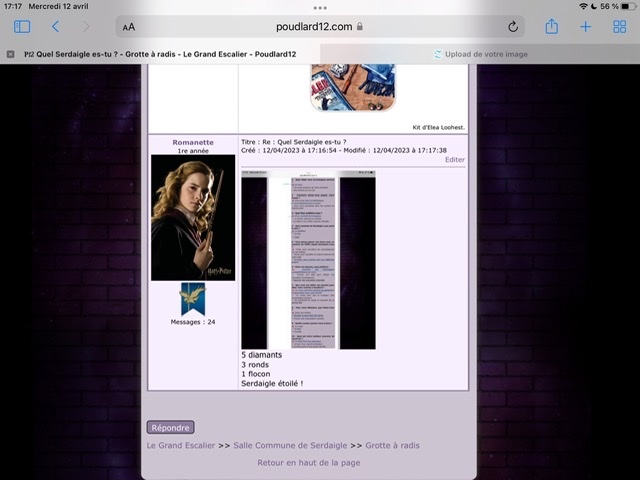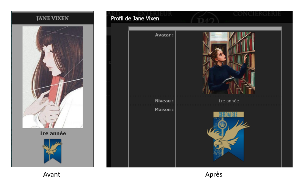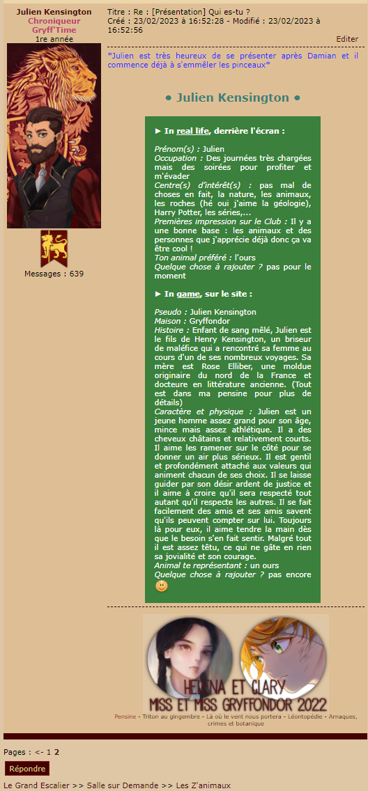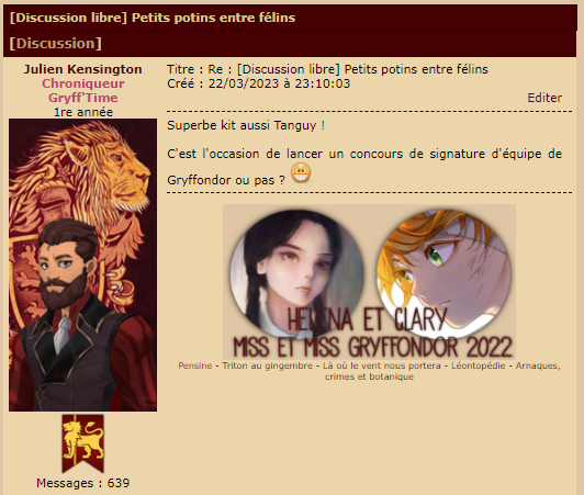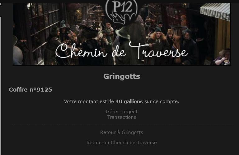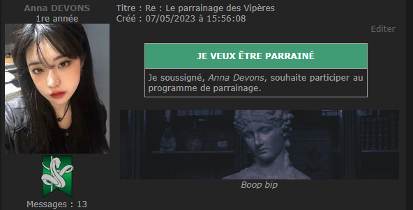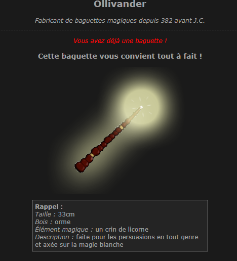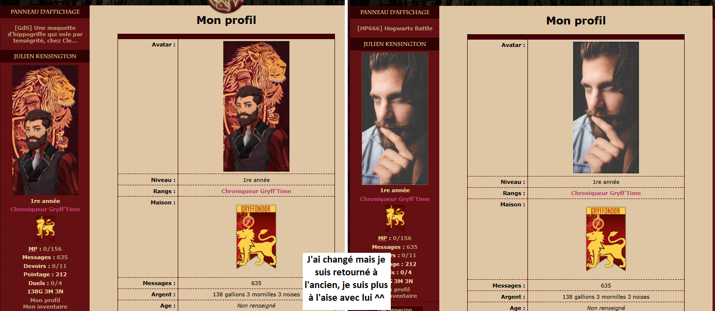 Revêtir des vêtements neufs : changer son avatar. Si besoin, se rendre dans une des boutiques 5 pts Preuve : Lien de l'image Ouvrir un compte à Gringotts 5 pts Preuve : Lien de l'image Acheter une baguette magique 5 pts Preuve : Lien de l'image Créer sa pensine 5 pts Preuve : Lien de ma pensine Edit de Mary : Coucou ! Ne t'inquiète pas, tu peux toujours éditer ton post pour rajouter de nouvelles preuves. Je t'informe juste que tu trouveras un suivi de la validation de tes défis ici. Je ne modifierai pas directement ton post pour noter les défis validés, je modifierai juste ce récapitulatif. :3 ![]() Découvrir le Hall d'Entrée : Se présenter dans le topic d’accueil aux autres élèves du château 5 pts Preuve : Poster un message dans le bureau des Préfètes-en-Chef 5 pts Preuve : Se rendre dans le lieu RPG « Le Hall d'entrée » et écrire un petit RPG 10 pts Preuve : Participer à une Soirée de Miry 10 pts Preuve : ![]() ![]() |