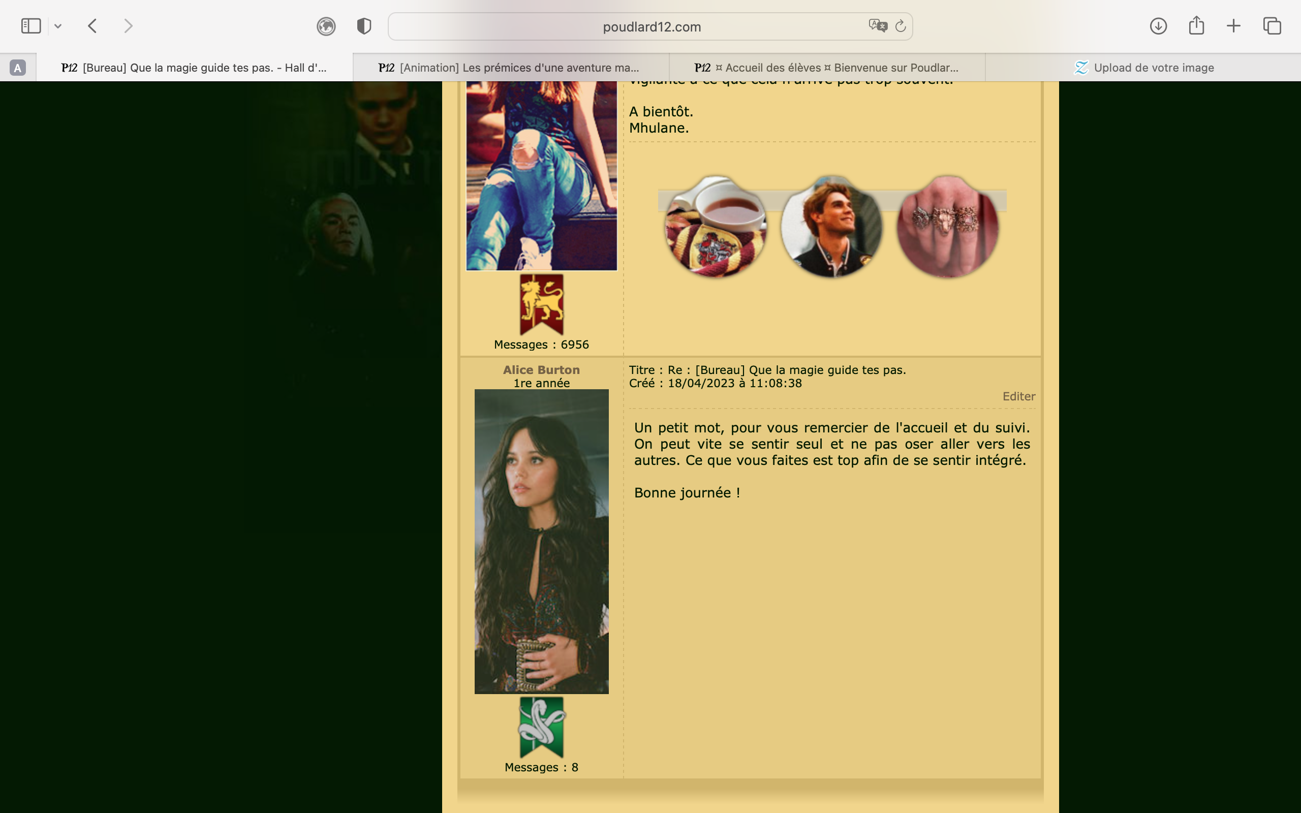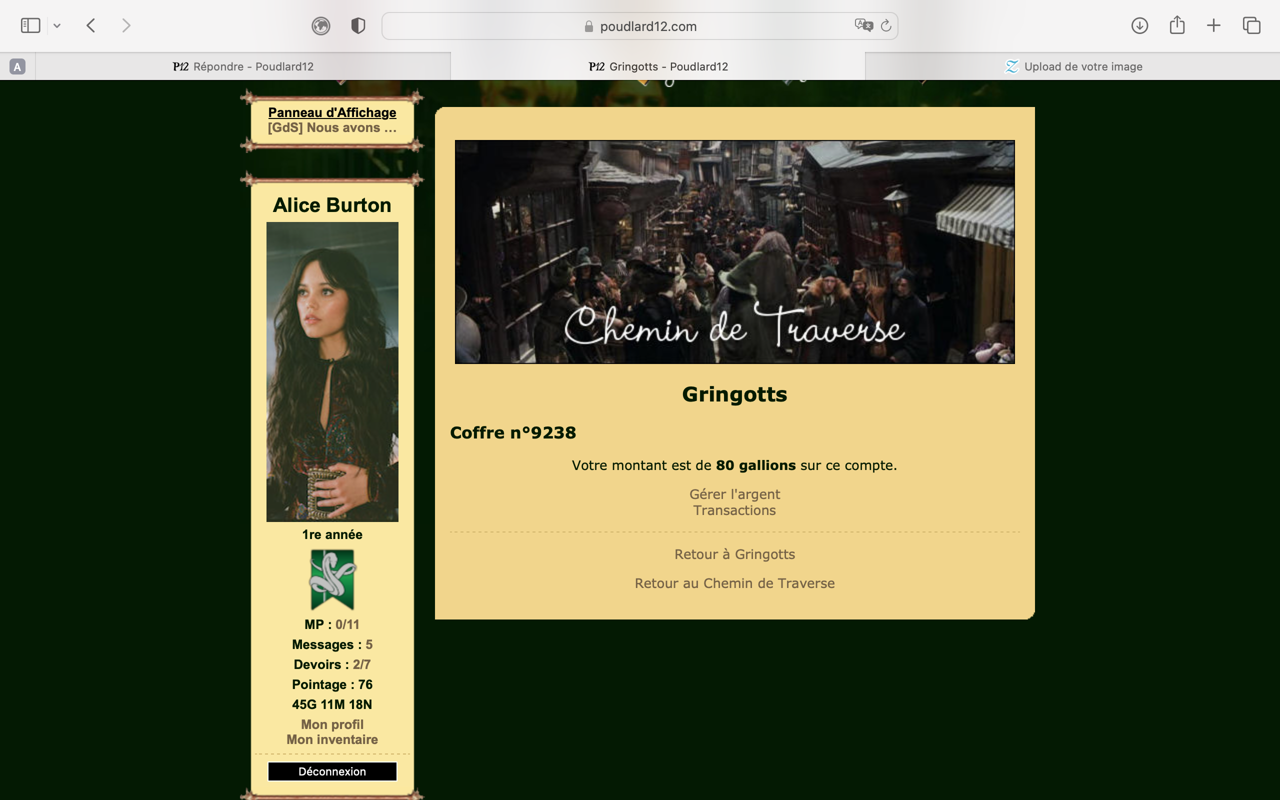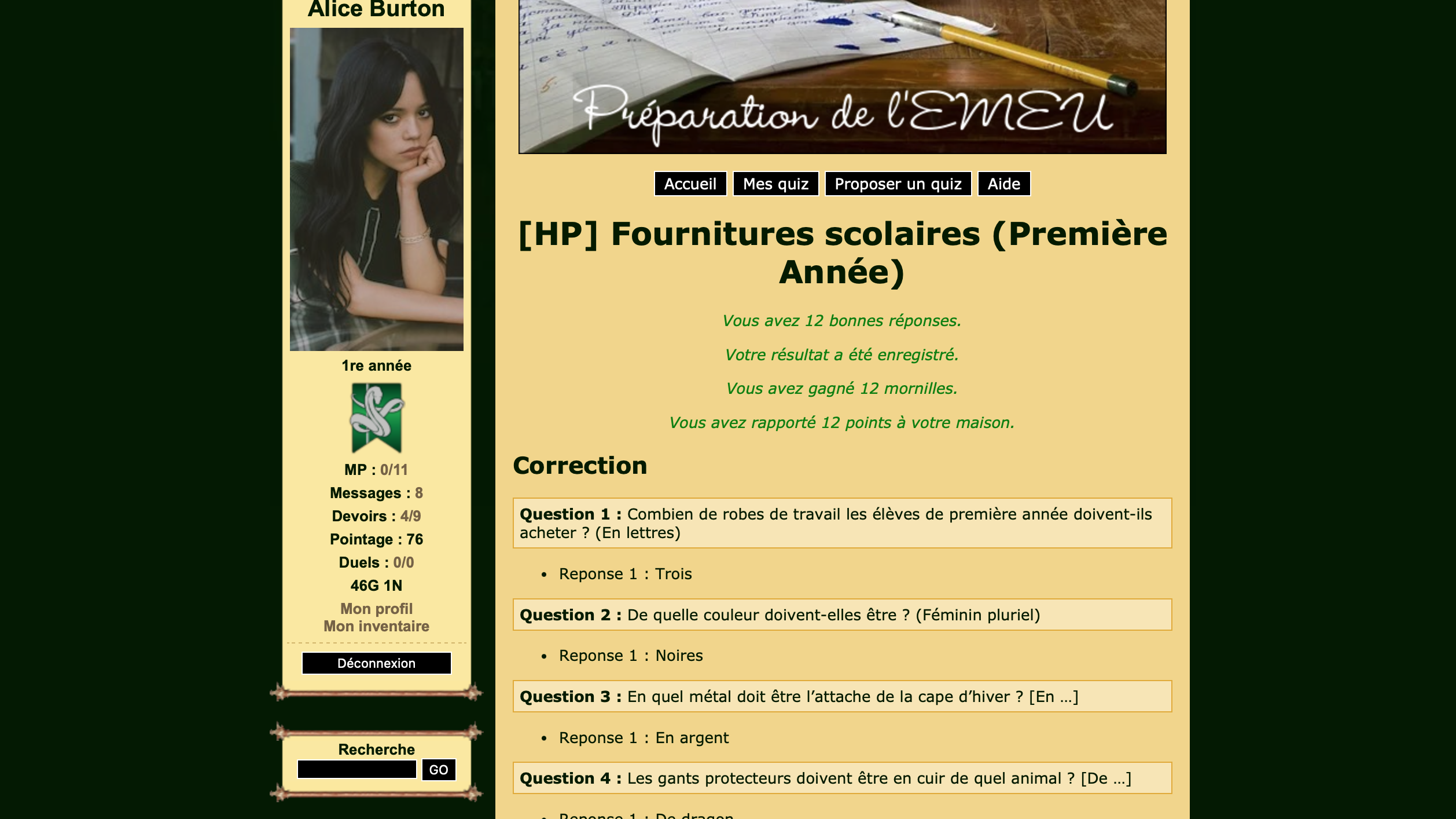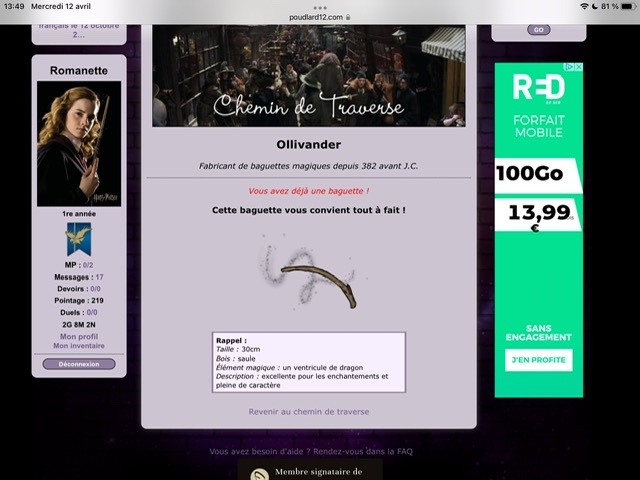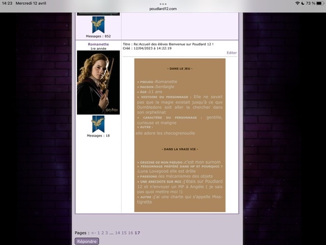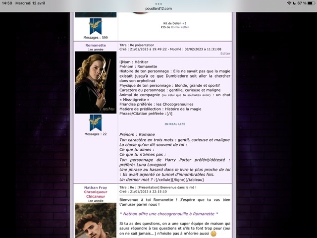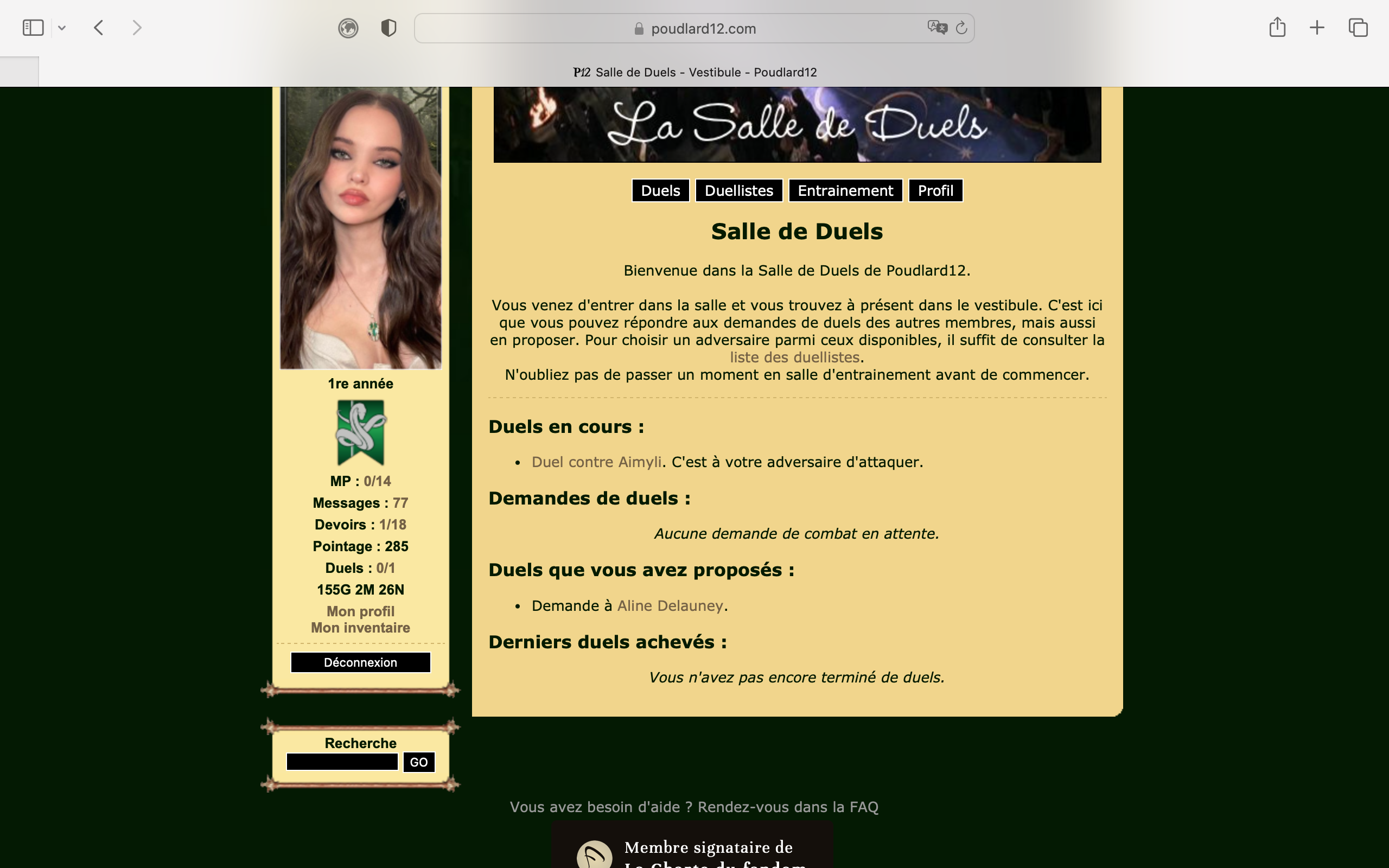 Revêtir des vêtements neufs : changer son avatar. Si besoin, se rendre dans une des boutiques 5 pts Preuve : Lien de l'image Ouvrir un compte à Gringotts 5 pts Preuve : Lien de l'image Acheter une baguette magique 5 pts Preuve : Lien de l'image Créer sa pensine 5 pts Preuve : Lien de ma pensine Edit de Mary : Coucou ! Ne t'inquiète pas, tu peux toujours éditer ton post pour rajouter de nouvelles preuves. Je t'informe juste que tu trouveras un suivi de la validation de tes défis ici. Je ne modifierai pas directement ton post pour noter les défis validés, je modifierai juste ce récapitulatif. :3 ![]() Découvrir le Hall d'Entrée : Se présenter dans le topic d’accueil aux autres élèves du château 5 pts Preuve : Poster un message dans le bureau des Préfètes-en-Chef 5 pts Preuve : Se rendre dans le lieu RPG « Le Hall d'entrée » et écrire un petit RPG 10 pts Preuve : Participer à une Soirée de Miry 10 pts Preuve : ![]() ![]() |