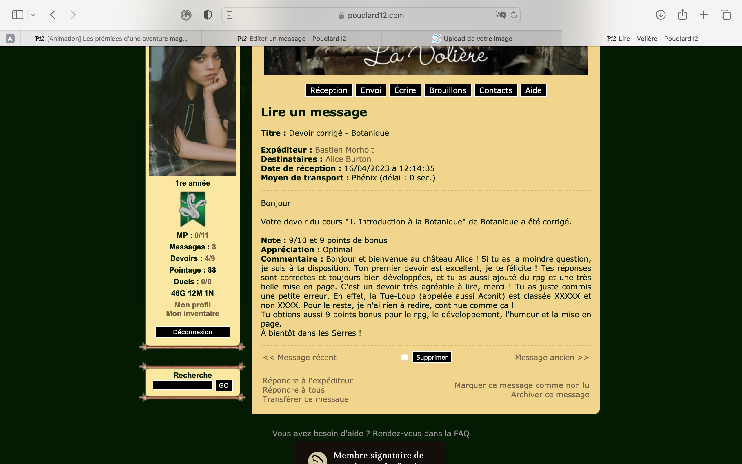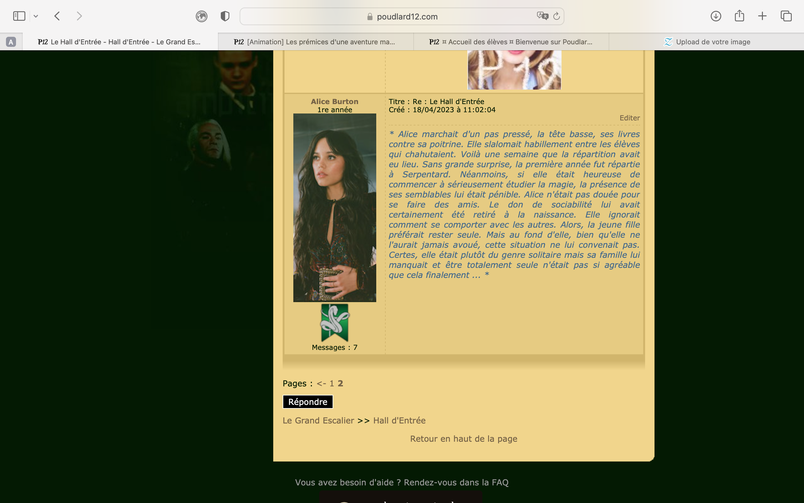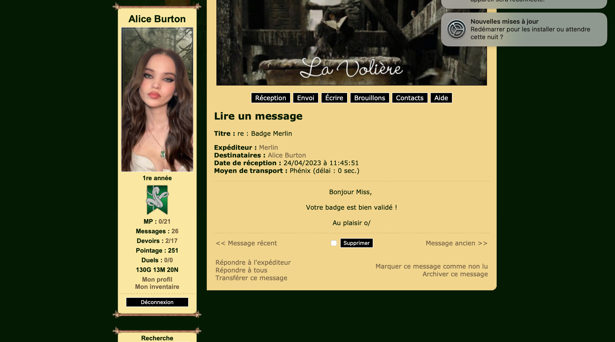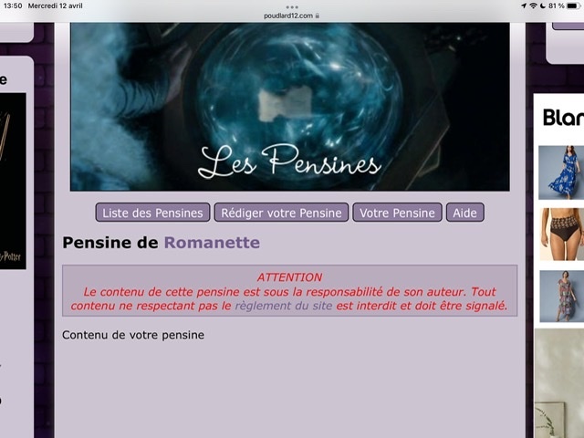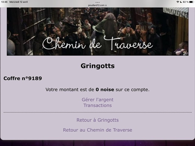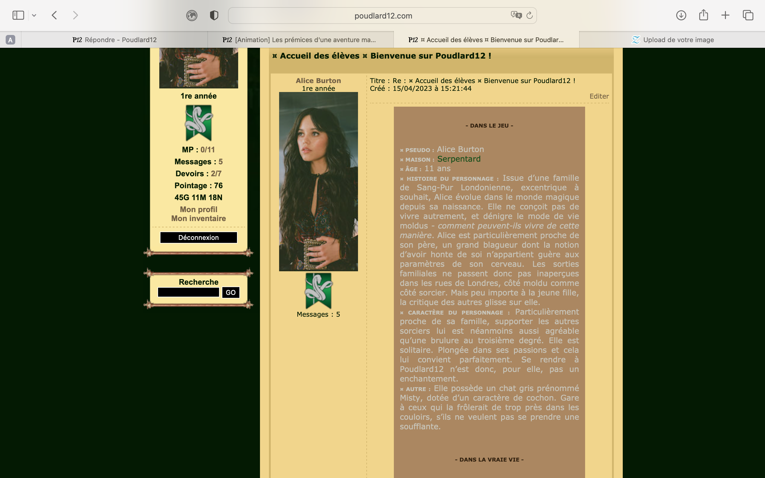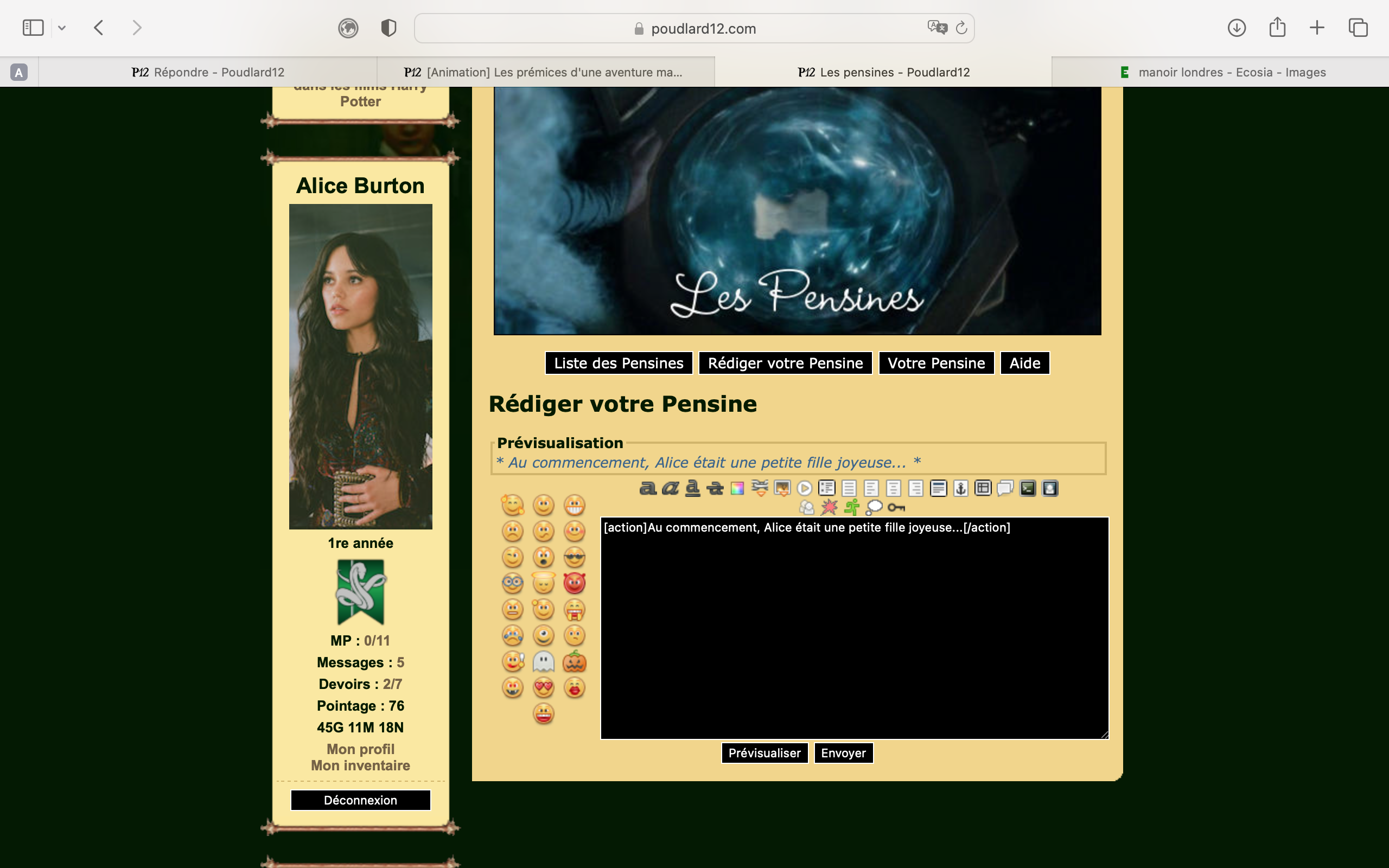 Revêtir des vêtements neufs : changer son avatar. Si besoin, se rendre dans une des boutiques 5 pts Preuve : Lien de l'image Ouvrir un compte à Gringotts 5 pts Preuve : Lien de l'image Acheter une baguette magique 5 pts Preuve : Lien de l'image Créer sa pensine 5 pts Preuve : Lien de ma pensine Edit de Mary : Coucou ! Ne t'inquiète pas, tu peux toujours éditer ton post pour rajouter de nouvelles preuves. Je t'informe juste que tu trouveras un suivi de la validation de tes défis ici. Je ne modifierai pas directement ton post pour noter les défis validés, je modifierai juste ce récapitulatif. :3 ![]() Découvrir le Hall d'Entrée : Se présenter dans le topic d’accueil aux autres élèves du château 5 pts Preuve : Poster un message dans le bureau des Préfètes-en-Chef 5 pts Preuve : Se rendre dans le lieu RPG « Le Hall d'entrée » et écrire un petit RPG 10 pts Preuve : Participer à une Soirée de Miry 10 pts Preuve : ![]() ![]() |