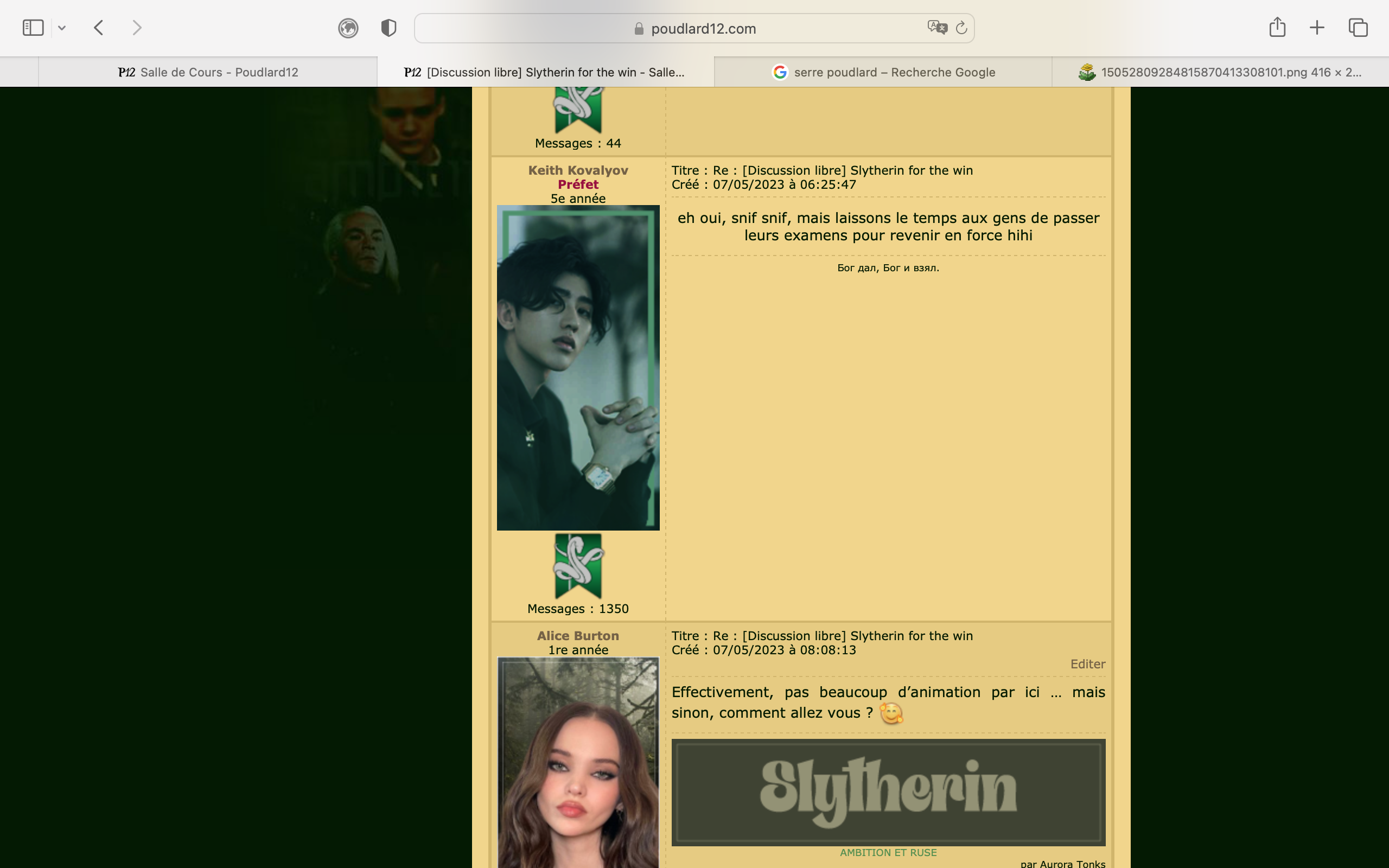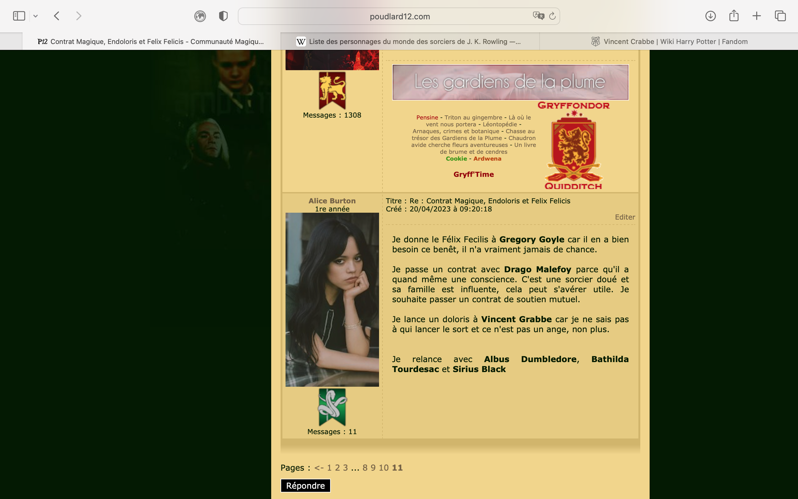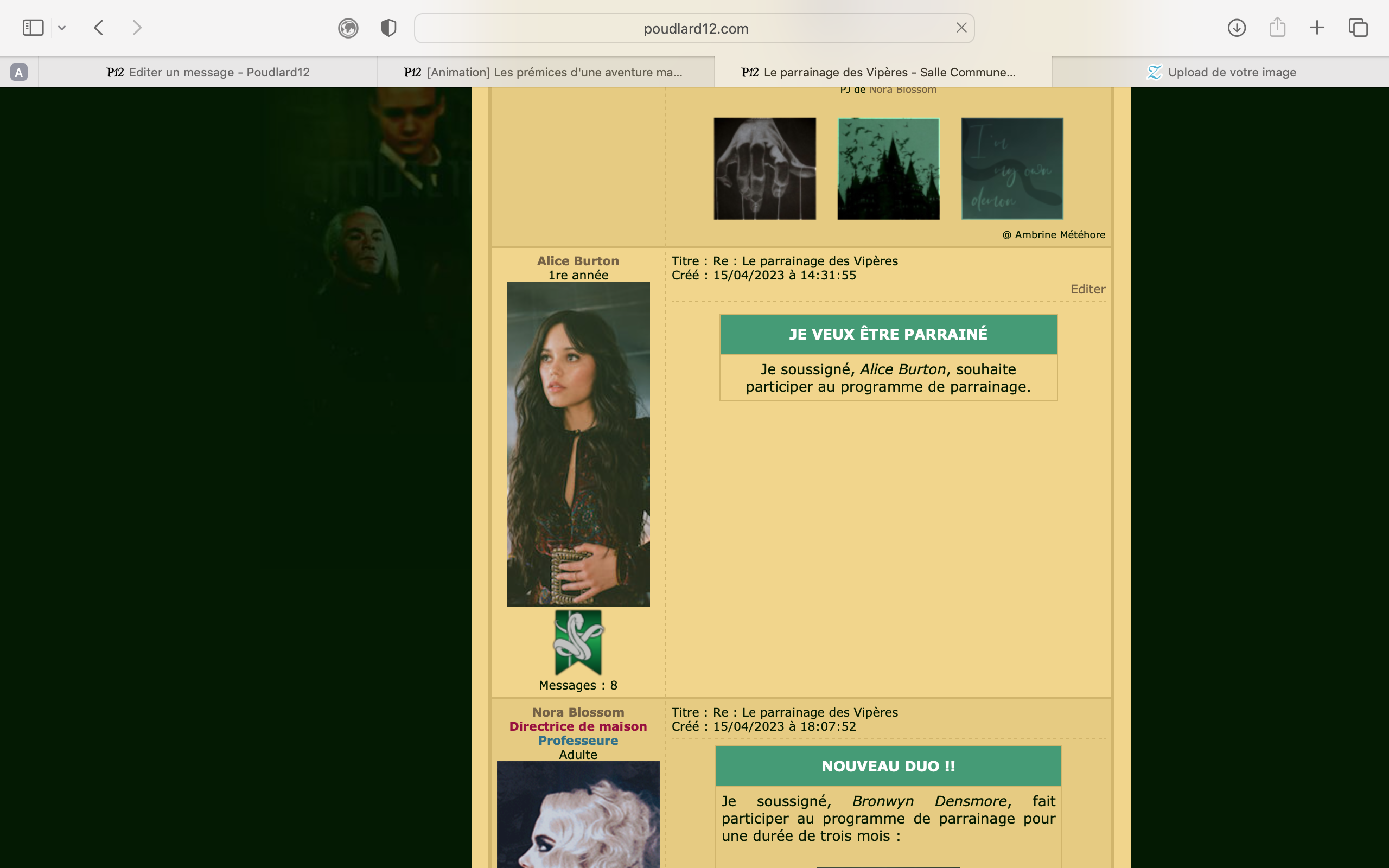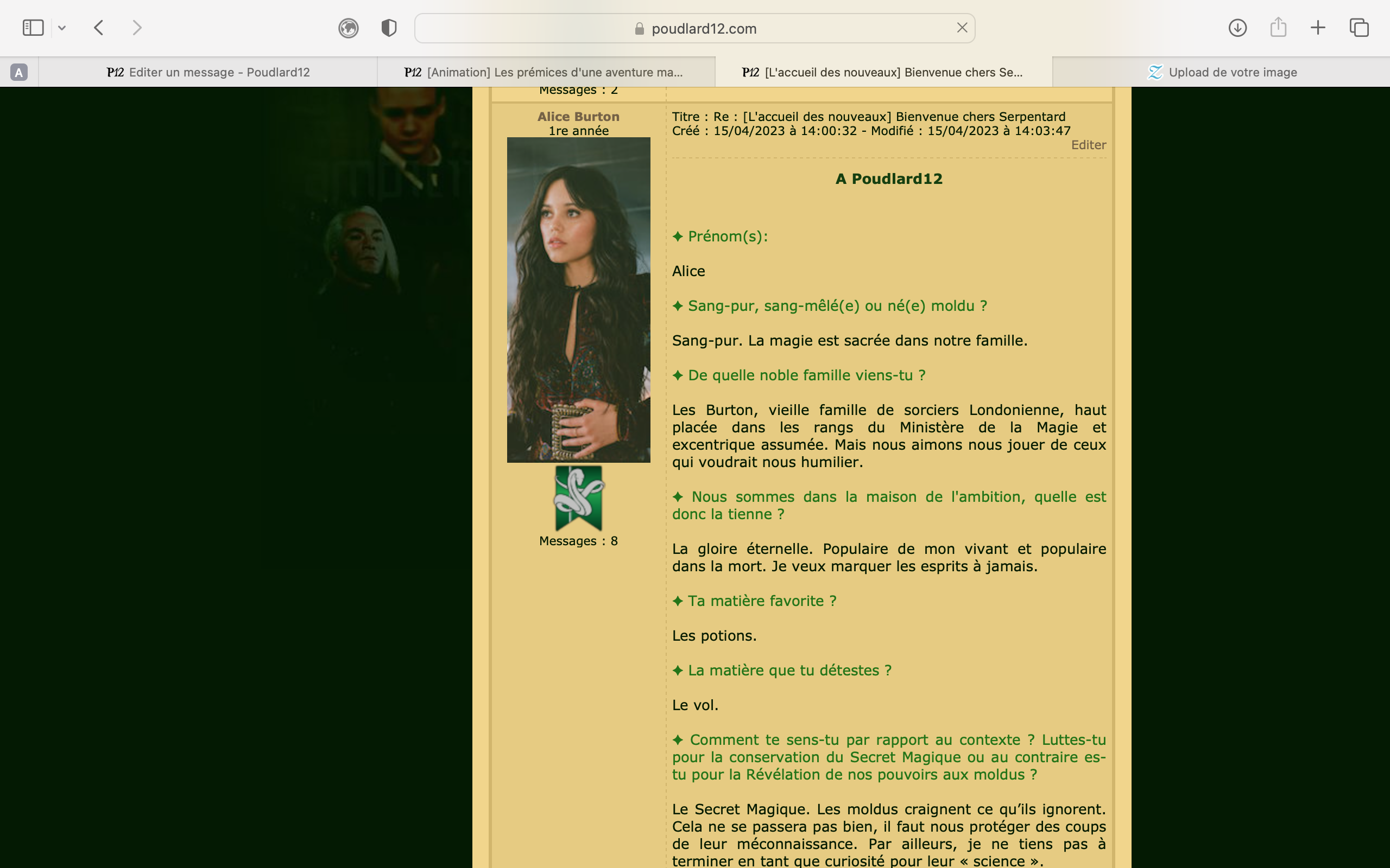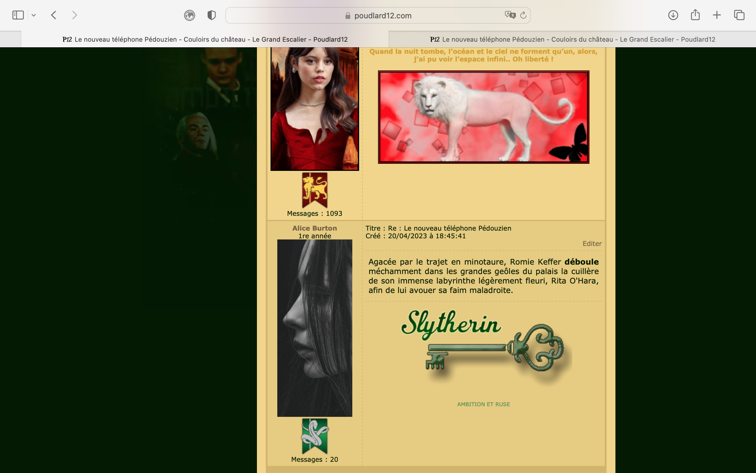 Revêtir des vêtements neufs : changer son avatar. Si besoin, se rendre dans une des boutiques 5 pts Preuve : Lien de l'image Ouvrir un compte à Gringotts 5 pts Preuve : Lien de l'image Acheter une baguette magique 5 pts Preuve : Lien de l'image Créer sa pensine 5 pts Preuve : Lien de ma pensine Edit de Mary : Coucou ! Ne t'inquiète pas, tu peux toujours éditer ton post pour rajouter de nouvelles preuves. Je t'informe juste que tu trouveras un suivi de la validation de tes défis ici. Je ne modifierai pas directement ton post pour noter les défis validés, je modifierai juste ce récapitulatif. :3 ![]() Découvrir le Hall d'Entrée : Se présenter dans le topic d’accueil aux autres élèves du château 5 pts Preuve : Poster un message dans le bureau des Préfètes-en-Chef 5 pts Preuve : Se rendre dans le lieu RPG « Le Hall d'entrée » et écrire un petit RPG 10 pts Preuve : Participer à une Soirée de Miry 10 pts Preuve : ![]() ![]() |