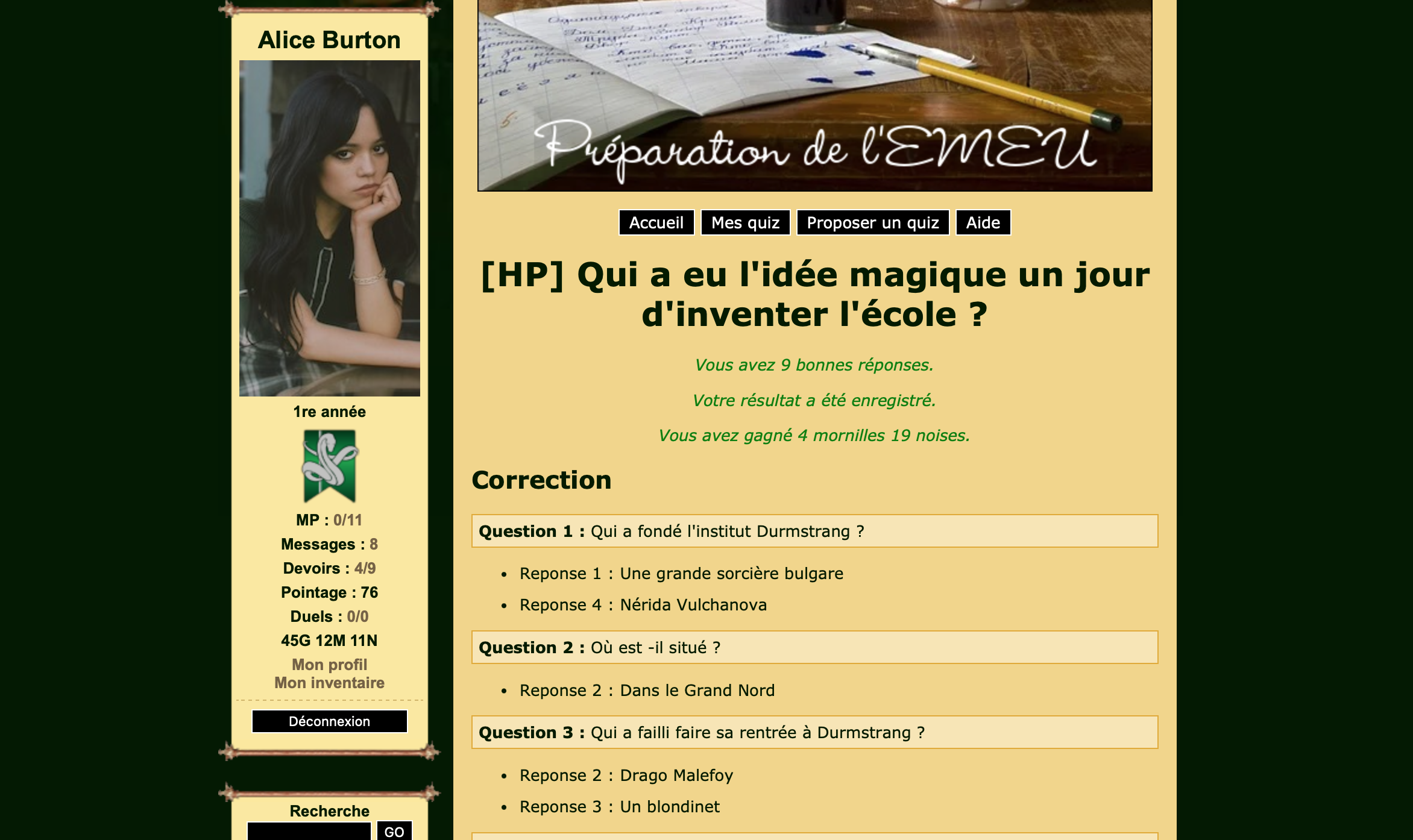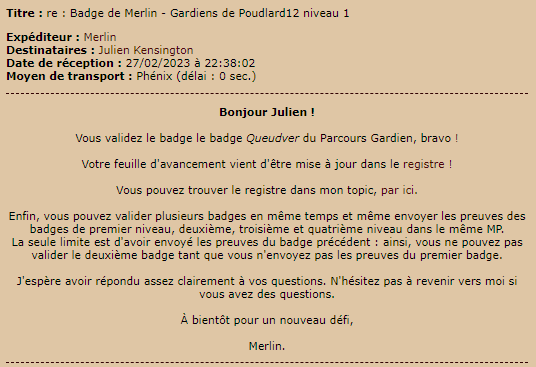 Au commencement : Revêtir des vêtements neufs [ validé ] Ouvrir un compte à Gringotts [ validé ] Acheter une baguette magique [ validé ] Créer sa pensine [ validé ] Découvrir le hall d'entrée : Se présenter dans le topic d'accueil [ validé ] Poster un message dans le bureau des préfètes [ validé ] Se rendre dans le RPG "Hall d'entrée" [ validé ] Découvrir sa salle commune : Se présenter en salle commune [ validé ] demander un parrain ou une marraine [ validé ] participer à un jeu de sa salle commune [ validé ] Se rendre dans le salon de sa maison sur le tchat [ validé ] Explorer le forum : Réaliser 3 quiz de niveaux différents Faire un duel faire un devoir Participer à une animation du grand escalier Edit de Mary : Coucou ! Ne t'inquiète pas, tu peux toujours éditer ton message avec tes nouvelles preuves. C'est super de te voir aussi active, continue ainsi ! Tes premiers défis sont bien validés. Tu peux retrouver ton avancement dans le récapitulatif dans le message juste avant le tien (ici). Je le mettrai à jour régulièrement ! :3