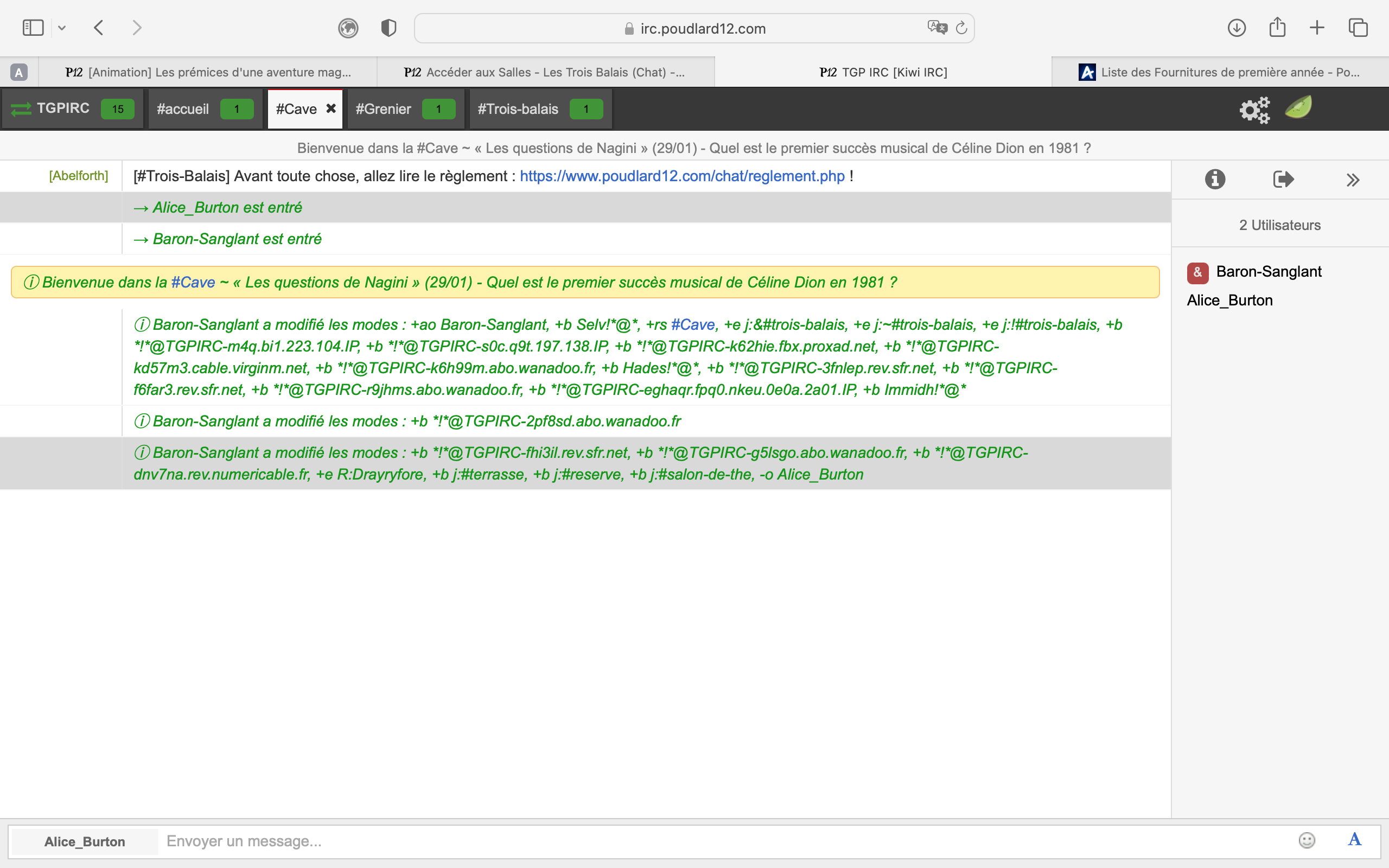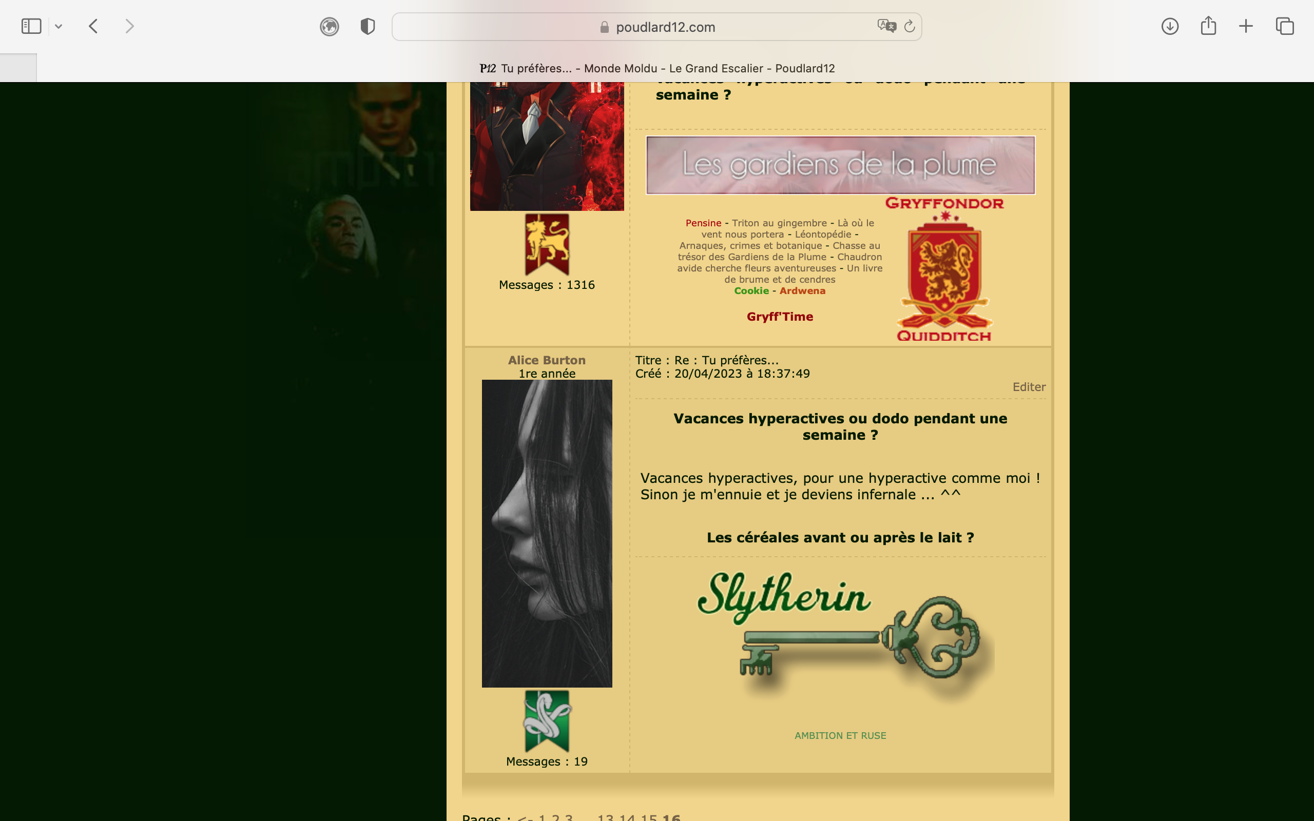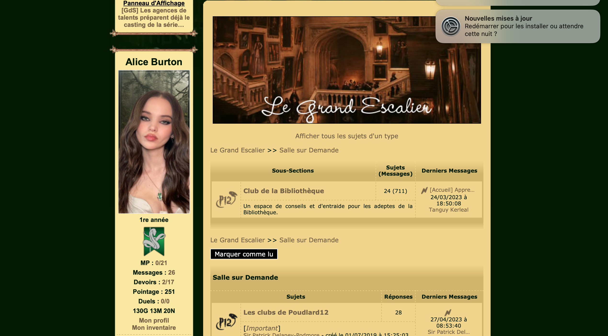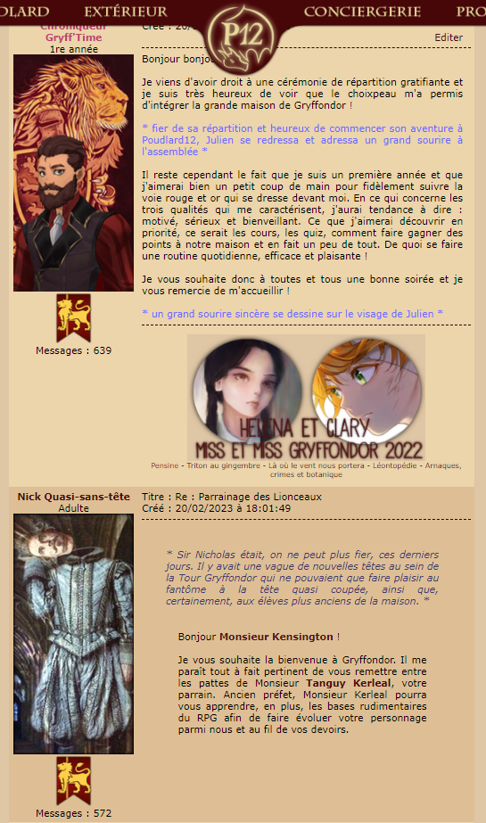 Créé : 15/03/2023 à 18:42:18 - Modifié : 01/09/2025 à 19:55:09 ![]() Que tu sois Né.e-Moldu.e, Sang-Mêlé ou Sang-Pur, tu es monté.e dans une barque qui t’a conduit.e jusqu’au château de Poudlard12, célèbre école de sorcellerie pour petits et grands élèves francophones. La magie est au rendez-vous, le monde des sorciers t'ouvre les bras, il ne te reste qu'à le saisir. Cours, créatures magiques, quiz, duels, RPG, Quidditch, bibliothèque et quantité d'autres aventures fabuleuses t'attendent ! Sans oublier les rencontres, le partage ou encore les amitiés ! Afin de t'aider à découvrir en douceur le site, voici l'animation « Les prémices d'une aventure magique » concoctée par mes soins (et par tes fabuleux Préfets-en-Chef). Cette animation est divisée en deux parties :
