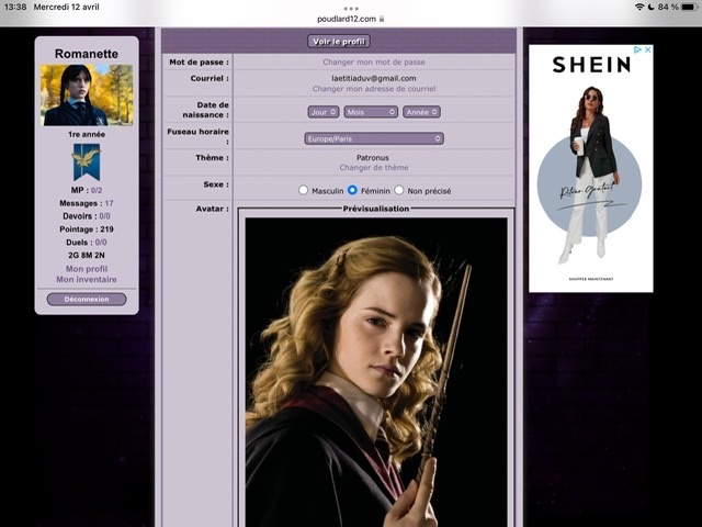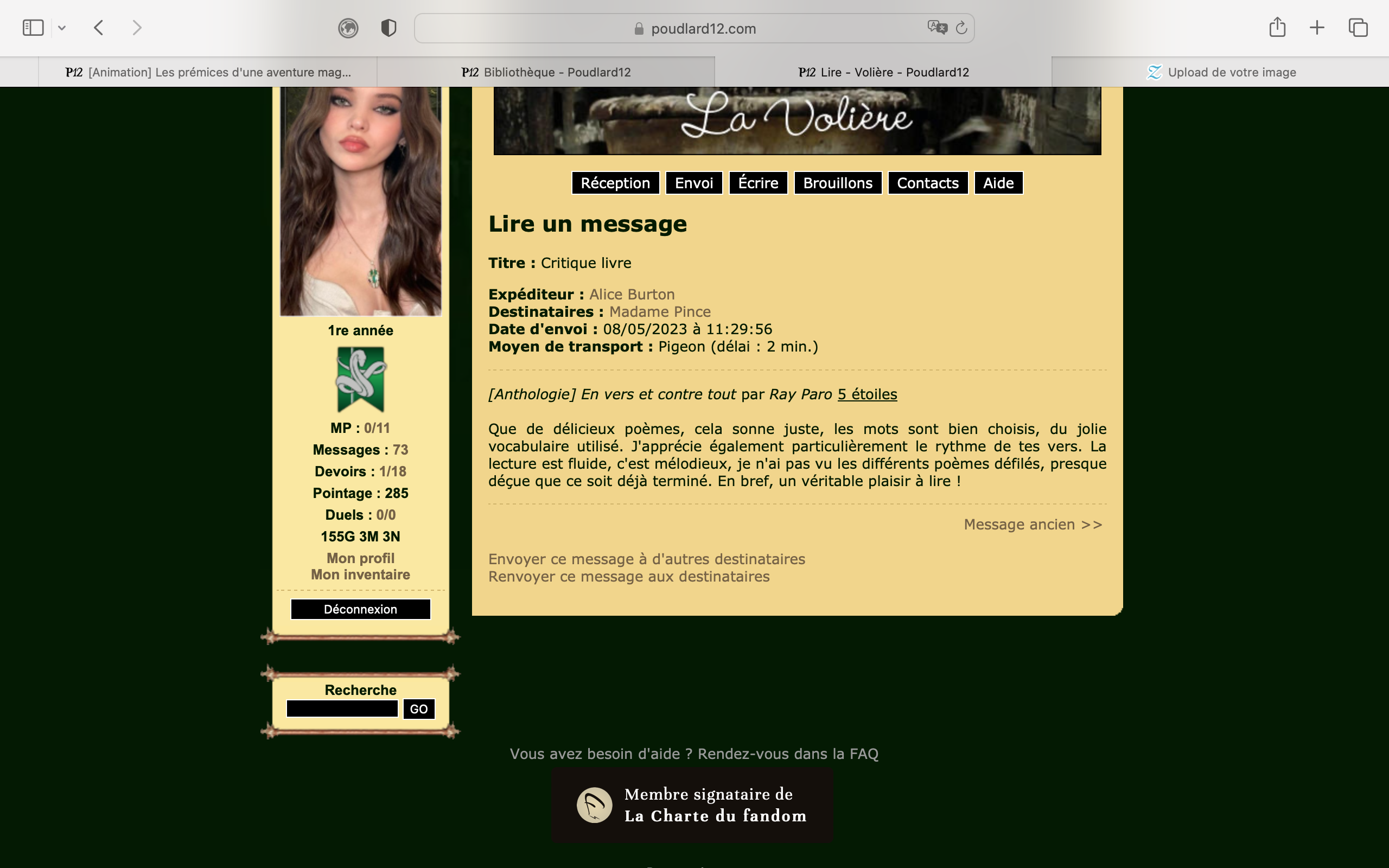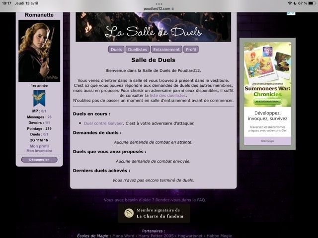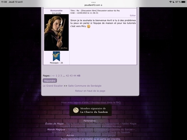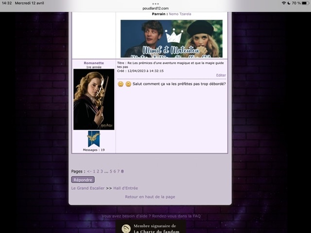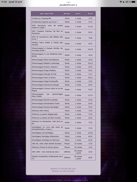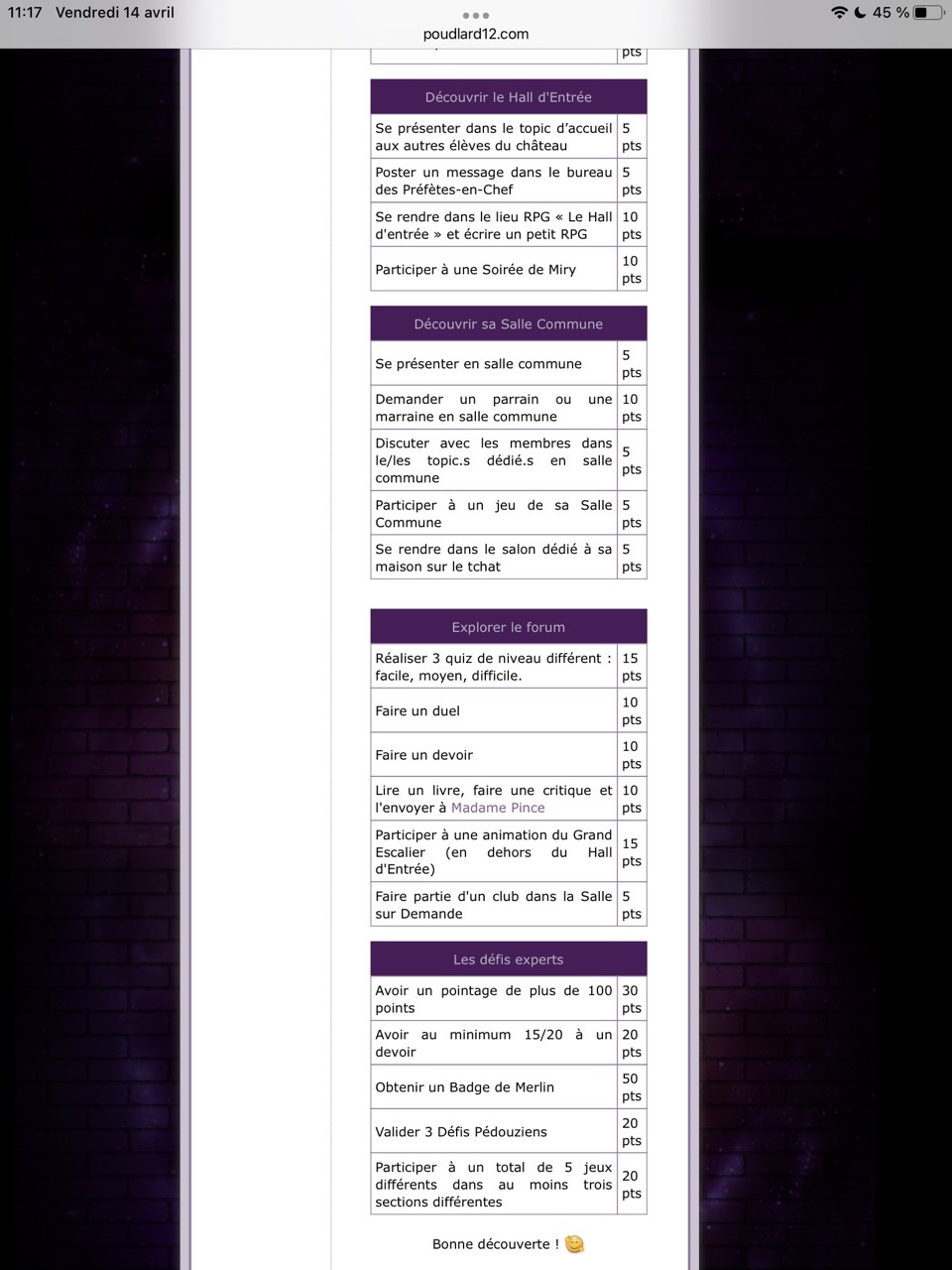 Je me lance dans les défis ! Nous somme le 31/03, j'ai donc jusqu'au 30/06 ! (ou 01/07 ?) Au commencement :Revêtir des vêtements neufs : changer son avatar. Si besoin, se rendre dans une des boutiques 5pts : Preuve Ouvrir un compte à Gringotts 5pts : Preuve Acheter une baguette magique 5pts : Preuve Créer sa pensine 5pts : Preuve Découvrir le Hall d'EntréeSe présenter dans le topic d’accueil aux autres élèves du château 5pts : Preuve Poster un message dans le bureau des Préfètes-en-Chef 5pts : Preuve Se rendre dans le lieu RPG « Le Hall d'entrée » et écrire un petit RPG 10pts : Preuve Participer à une Soirée de Miry 10pts : Découvrir sa Salle CommuneSe présenter en salle commune 5pts : Preuve Demander un parrain ou une marraine en salle commune10pts : J'ai déjà envoyé le formulaire à Luna sans avoir screen, comme j'ai pas envie de l'embêter je ne vais pas en refaire un, tant pis :/ Discuter avec les membres dans le/les topic.s dédié.s en salle commune 5pts : Preuve Participer à un jeu de sa Salle Commune 5pts : Preuve Se rendre dans le salon dédié à sa maison sur le tchat 5pts : Preuve Explorer le forumRéaliser 3 quiz de niveau différent : facile, moyen, difficile. 15pts : Preuve facile & Preuve Moyen & Preuve difficile (Bon apparemment je suis nulle en quiz haha !) Faire un duel 10pts : Faire un devoir 10pts : Preuve Lire un livre, faire une critique et l'envoyer à Madame Pince 10pts : Participer à une animation du Grand Escalier (en dehors du Hall d'Entrée) 15pts : Faire partie d'un club dans la Salle sur Demande 5pts : Les défis expertsAvoir un pointage de plus de 100 points 30pts : Avoir au minimum 15/20 à un devoir20pts : J'ai une question, car pour le moment je n'ai que des devoir noté sur 10. Si j'ai eu 15/10 (avec points bonus donc) ça fonctionne ? (je modifierai ce topic en fonction de la réponse :>) Obtenir un Badge de Merlin 50pts : Valider 3 Défis Pédouziens 20pts : Participer à un total de 5 jeux différents dans au moins trois sections différentes 20pts : Voila ! J'éditerai ce poste au fur et à mesure que j'avancerai dans le défi ! :> |