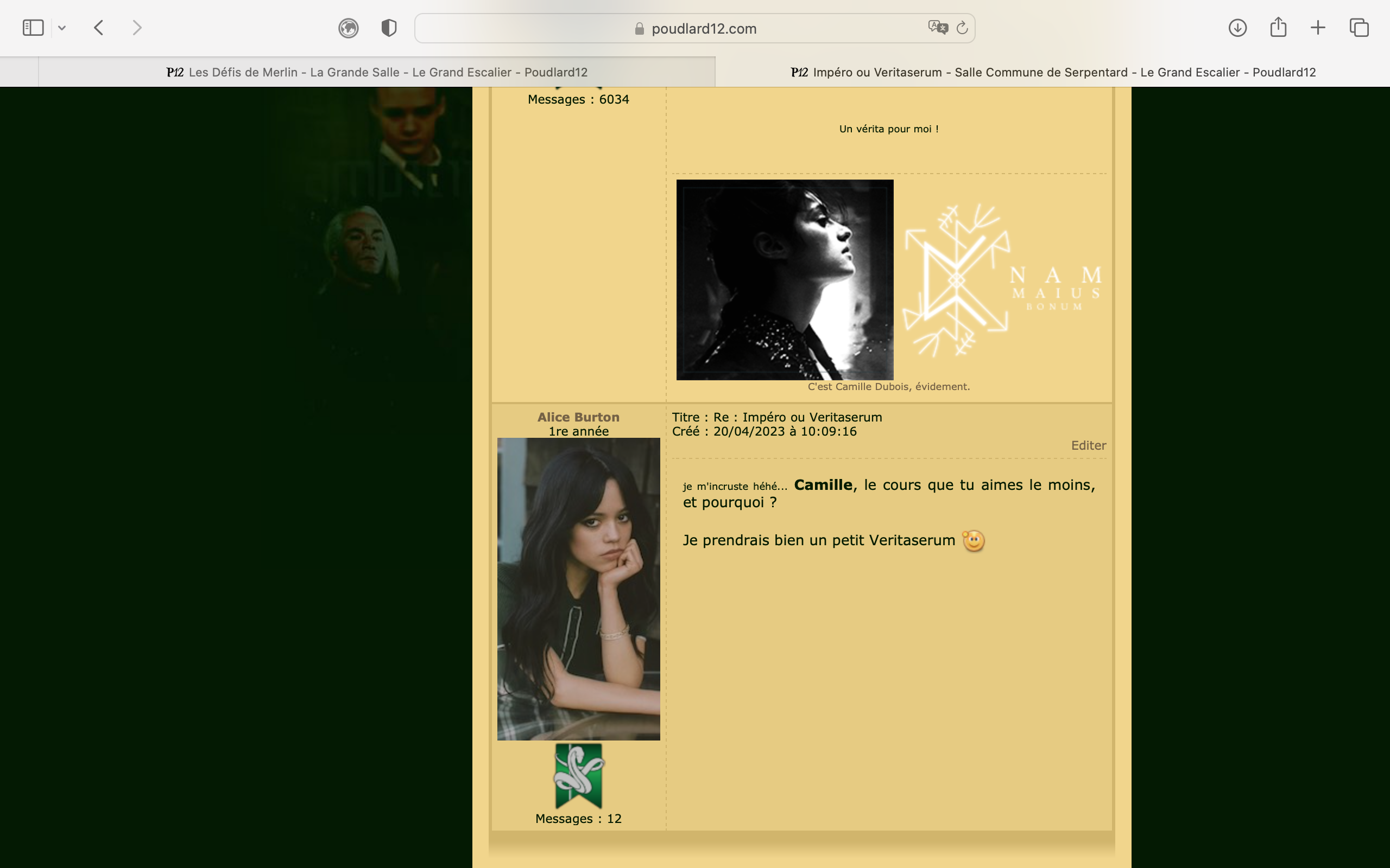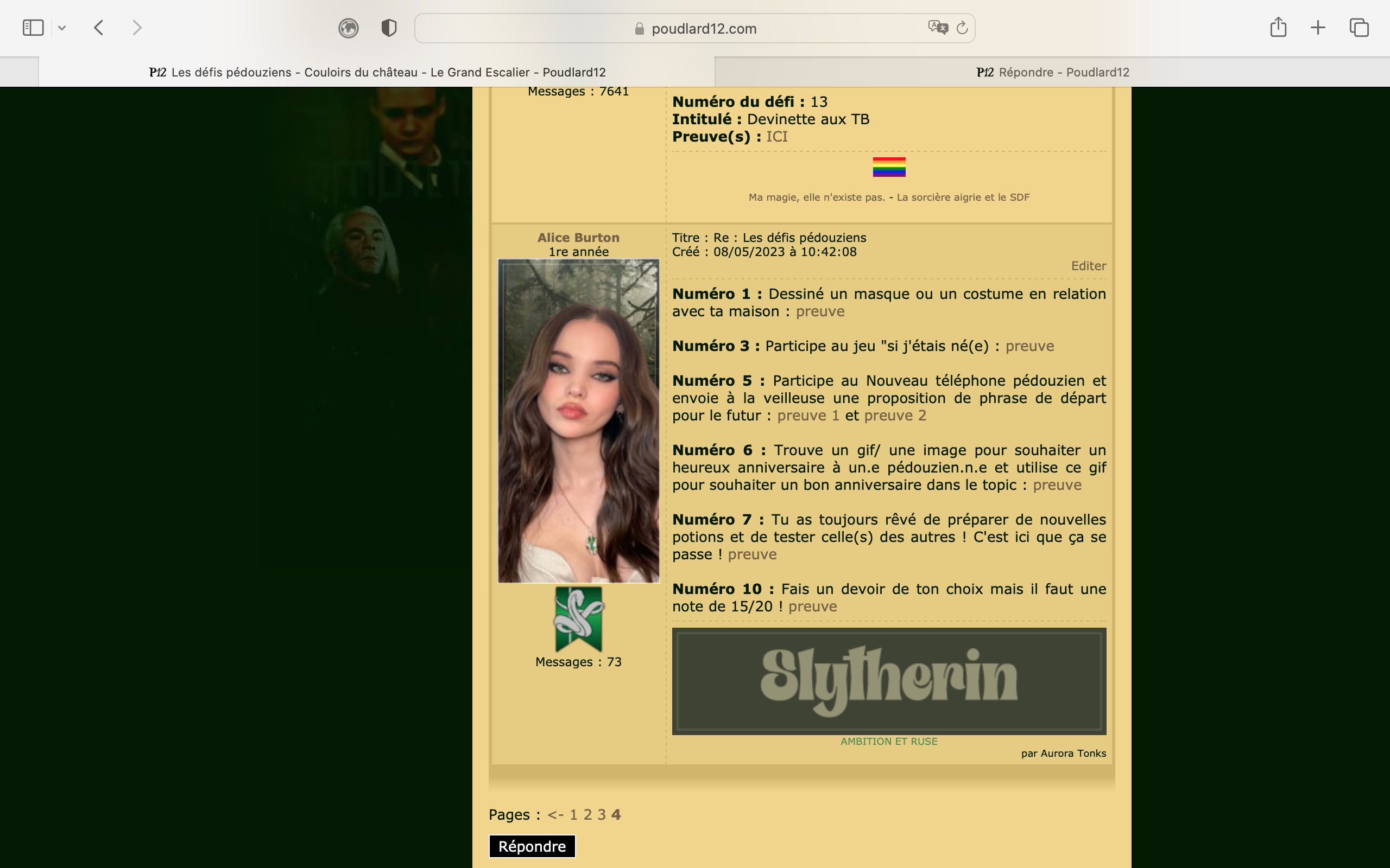 Être inscrit sur le site depuis moins de 6 mois. OU Avoir posté moins de 50 messages sur le forum. Note : Des exceptions peuvent être faites. Si tu n'entres dans aucune de ces catégories mais que tu reviens sur le forum après une longue absence, tu peux m'envoyer un message privé (Mary Williams) pour qu'on en discute ensemble. Une fois ta première preuve déposée, tu auras alors trois mois pour réaliser les autres défis. Passé ce délai, tu ne pourras plus faire valider de défis. Le deuxième message de ce topic récapitulera tes défis réalisés ainsi que ta deadline. Ainsi, tu ne seras pas perdu.e ! ![]() Maintenant que les règles sont claires, il est temps de découvrir les défis ! Les récompenses seront calculées comme suit : si tu gagnes un total de N points. Tu gagneras N/2 points de maison et N*10 noises.