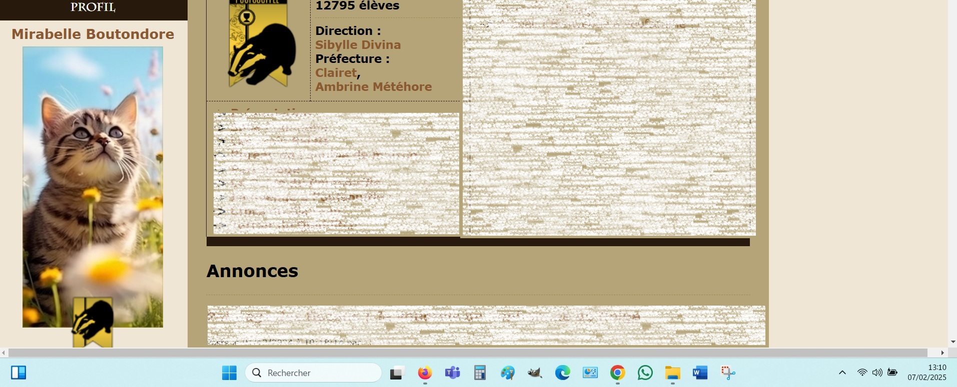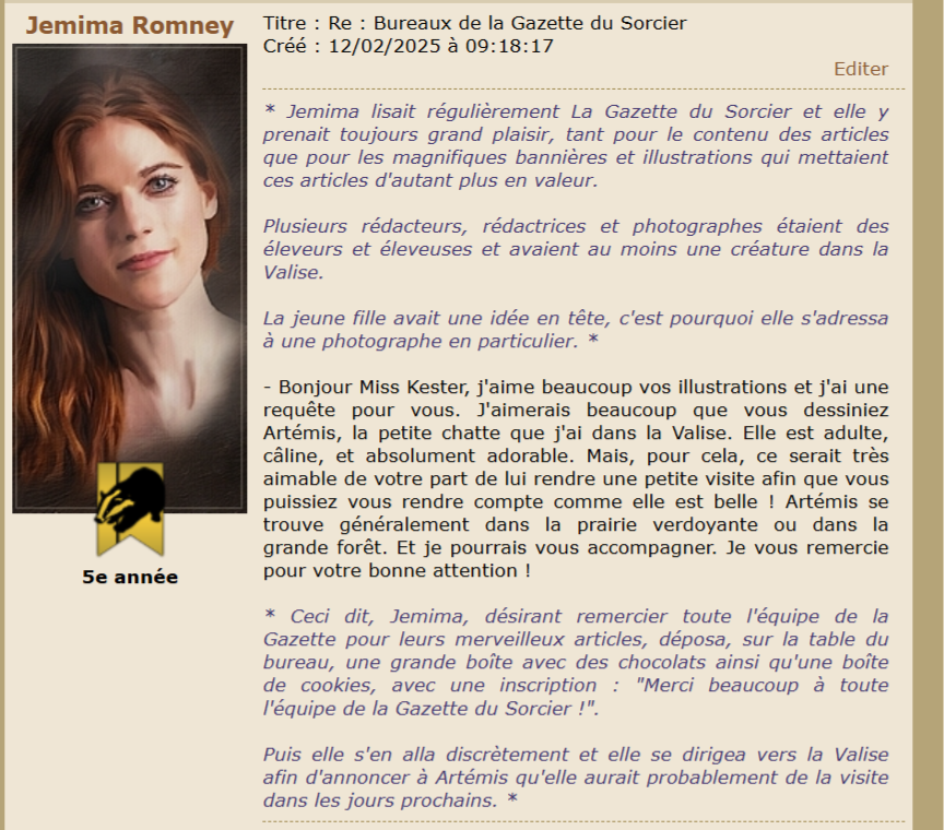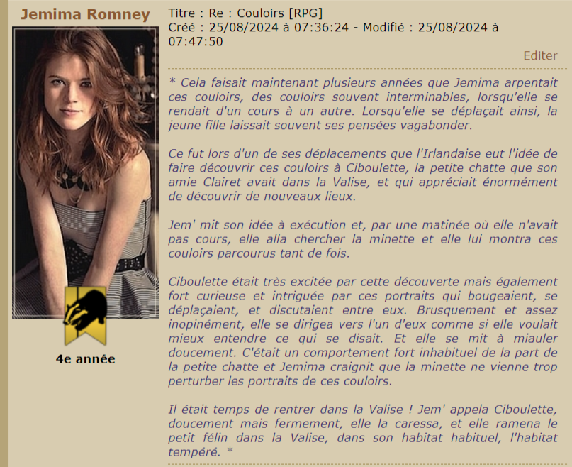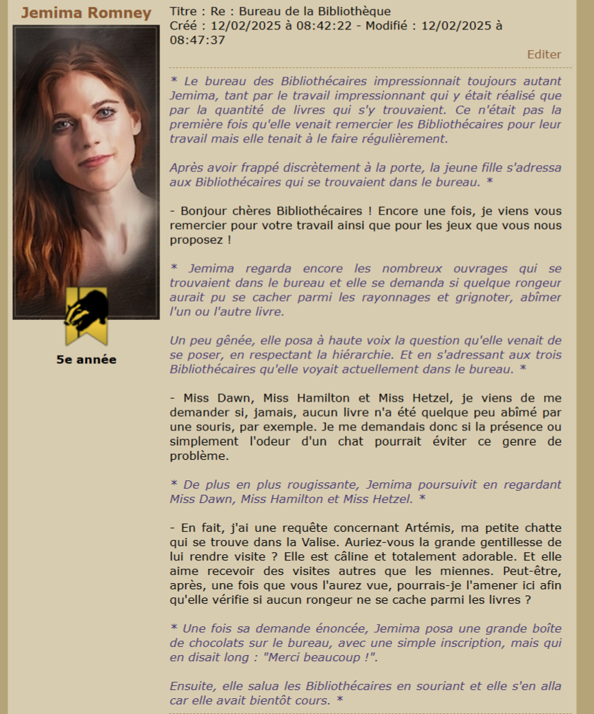 Préfète en chef Chroniqueuse Crocs Miss Poudlard12 2024 ![]() ![]() 4e année