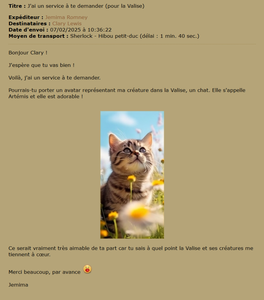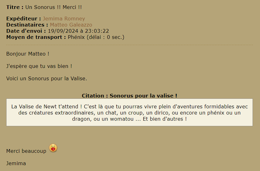 Voici pour mes défis solos : #2 (Acheter un objet pour votre créature) et #17 (Offrir un cadeau à l'une des créatures appartenant à l'un des Magizoologistes) - Preuve et aussi : cadeau RP à Zelie (des cloportes) : ici #12. Vanter les mérites de la Valise par MP à 3 non-éleveurs [Afficher]