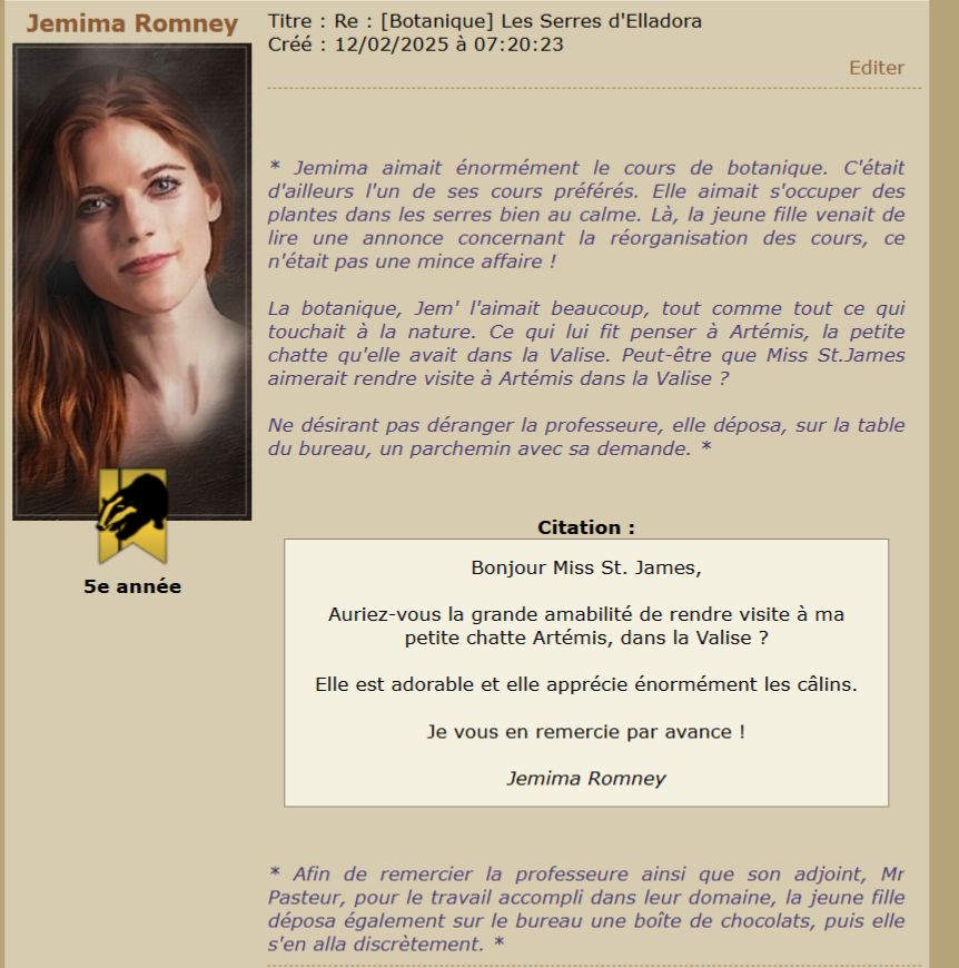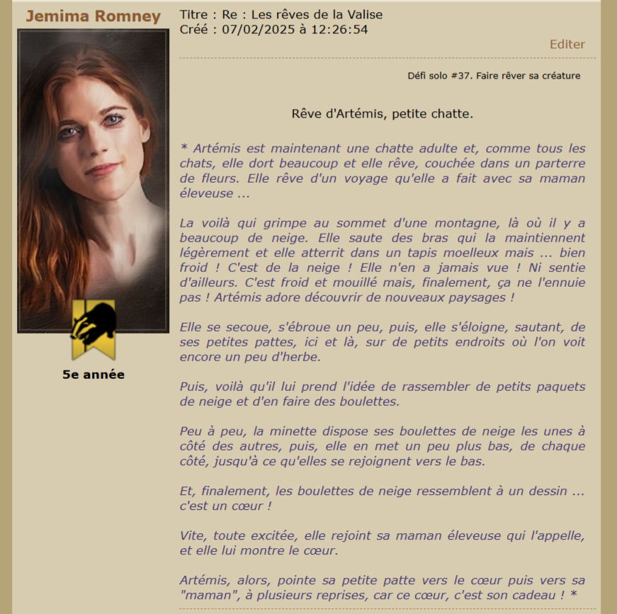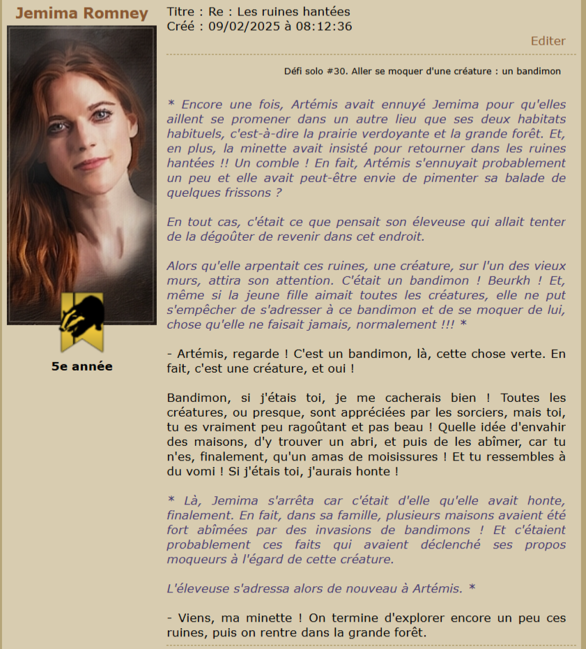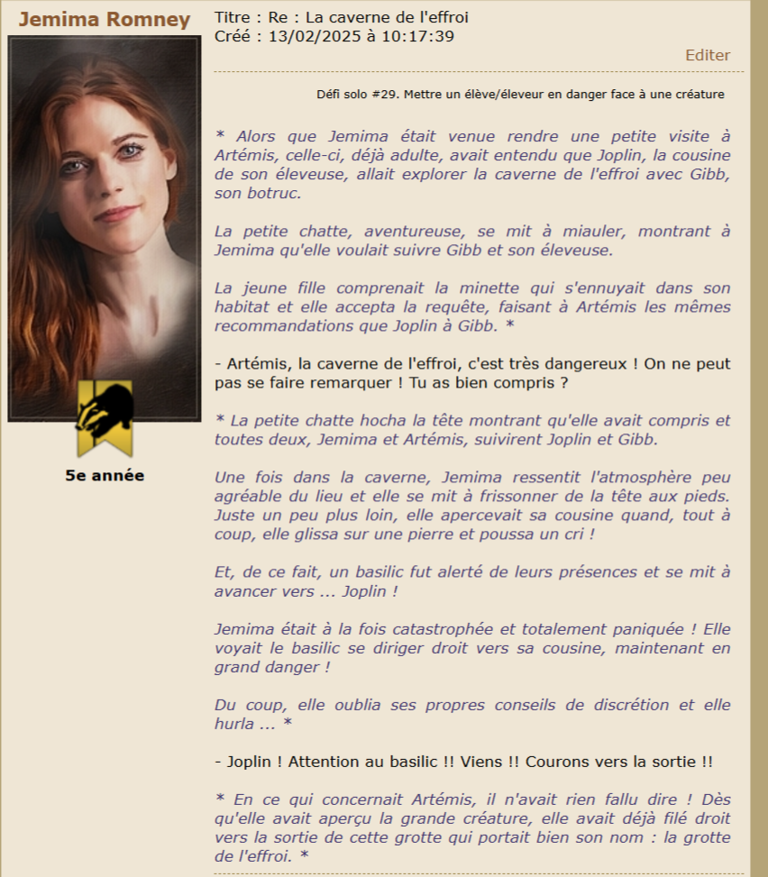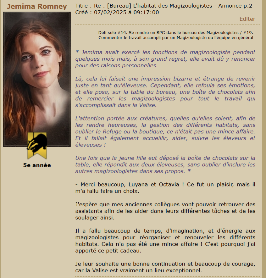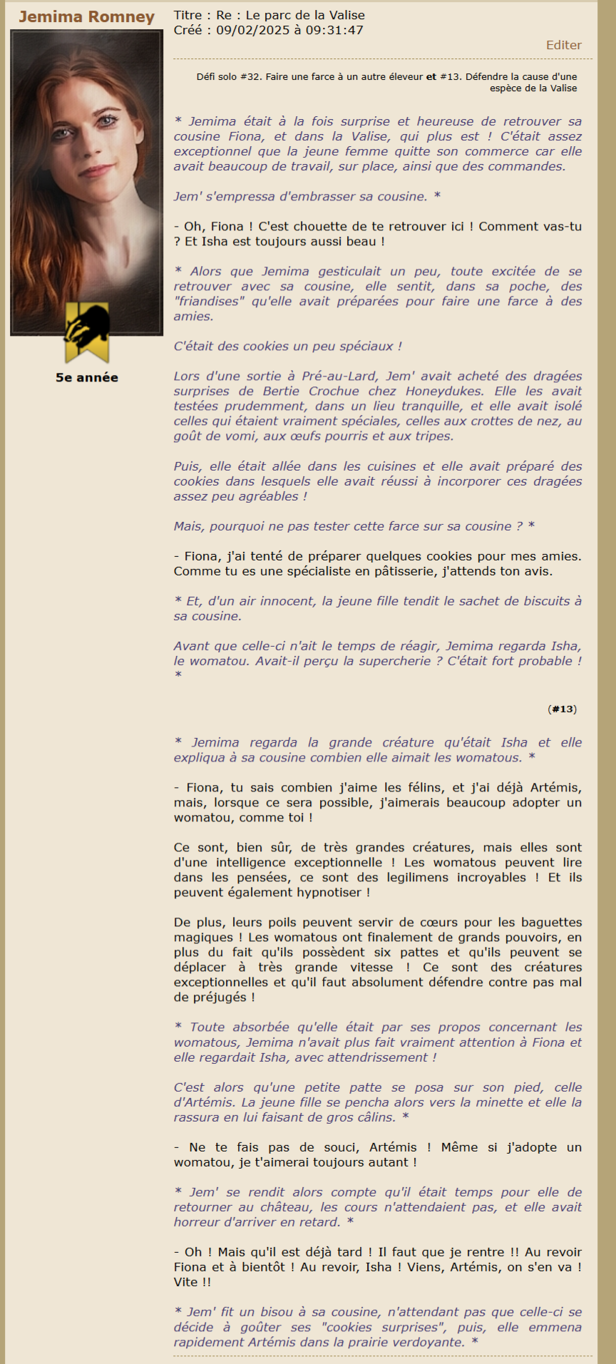 En ce qui me concerne, merci à l'une de mes collègues magizoologistes de bien vouloir valider mes défis solos, juste avant ceux de Théodora ![]() Défis validés, +75 ticketts. Fière marraine de Colin Vance