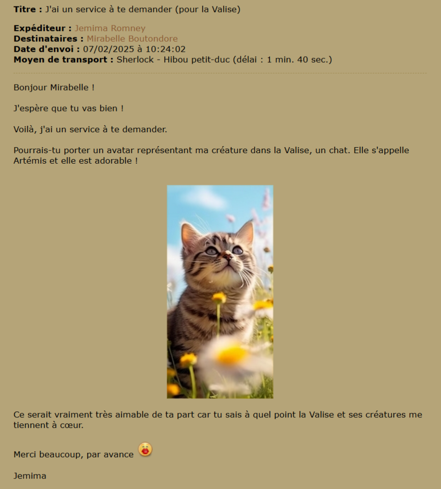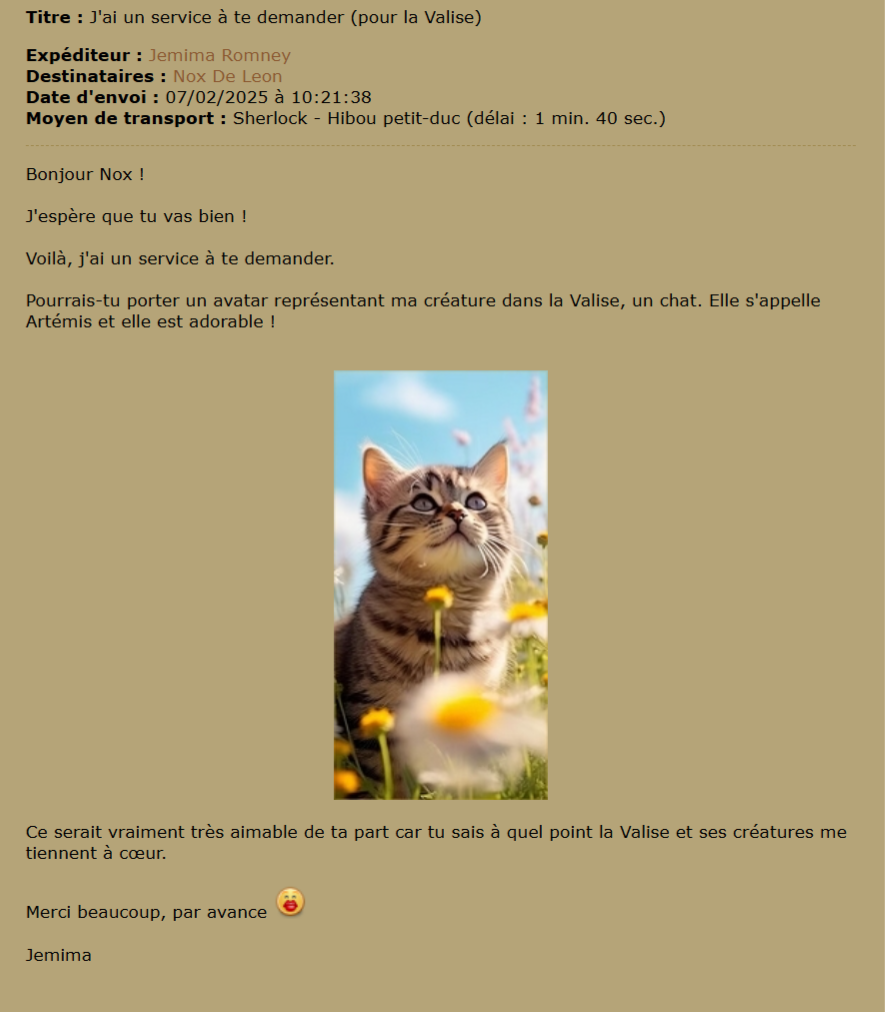 Jemima, les défis #1, #3, #5, #6, #8, #9 et #20 ont bien été validés, tu remportes donc 51 ticketts au total. Luyana, je te propose le défi #13. Défendre la cause d'une espèce de la Valise. ![]() ![]() |