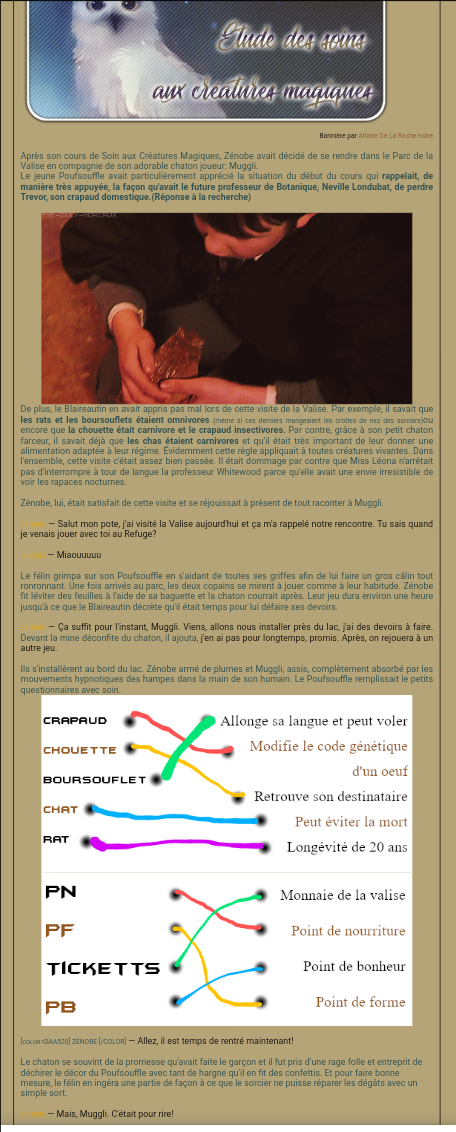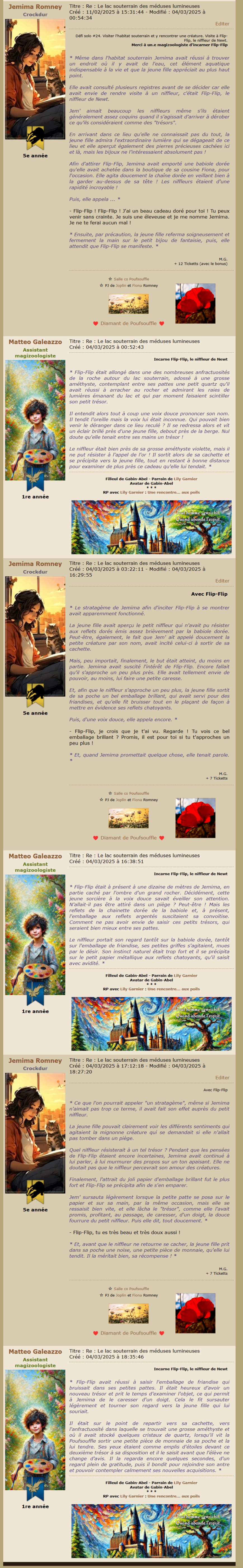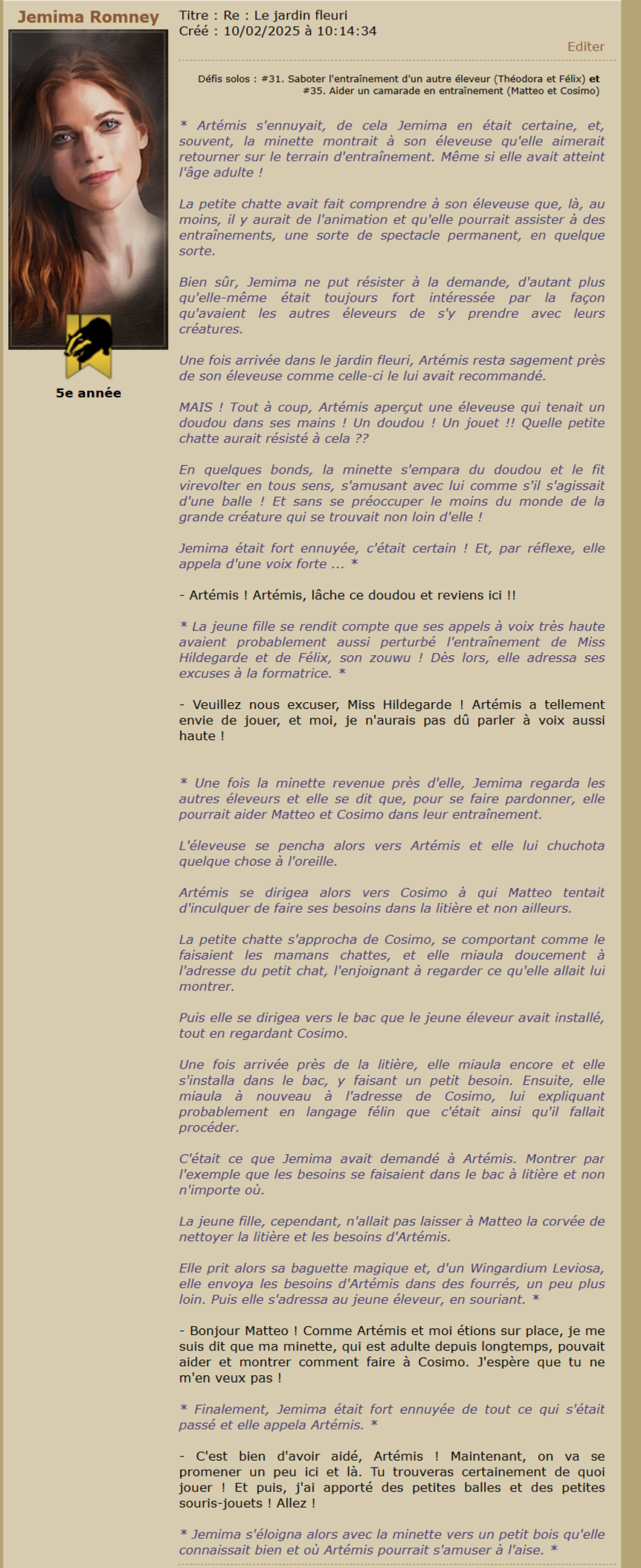 Spoiler : Les 3 non-éleveurs et les preuves des MP #4 et #38. Découvrir le parc commun (avec Artémis) et Faire un monologue positif à votre créature - Preuve #15. Écrire un poème à un Magizoologiste ou à Newt - Preuve #33. Faire un cadeau à un autre éleveur - Preuve #16. Aller rendre visite à l'une créature appartenant à l'un des Magizoologistes : Zelie - Grande forêt - Preuve #18. Rendre visite à l'une des créatures de Newt : Pickett - Prairie Verdoyante - Preuve #14. Se rendre en RPG dans le bureau des Magizoologistes et #19. Commenter le travail accompli par un Magizoologiste ou l'équipe en général - Preuve #37. Faire rêver sa créature (Fais de beaux rêves) - Preuve #10. Convaincre 5 personnes de porter un avatar représentant votre créature - Preuves : MP et screen du profil avec l'avatar pour Artémis / chat // 1 - Screen / 2 - Screen / 3 - Screen / 4 - Screen / 5 - Screen / 6 - Screen #30. Aller se moquer d'une créature : le bandimon - Preuve #32. Faire une farce à un autre éleveur et #13. Défendre la cause d'une espèce de la Valise (womatou) - Portoloin (Parc) - Screen #31. Saboter l'entraînement d'un autre éleveur (Théodora et Félix) et #35. Aider un camarade en entraînement (Matteo et Cosimo) - Preuves #11. Inviter RPGiquement 5 non-éleveurs à rendre visite à votre créature : Hellia St.James / Vitaly Moskovski / Rebecca Dawn (Matoutou), Angele Hamilton, Sophia Hetzel / Mia Kester (Léa Berry) / Adrian Deckbar #29. Mettre un élève/éleveur en danger face à une créature - Preuve #24. Visiter l'habitat souterrain et y rencontrer une créature - PREUVE Visite à Flip-Flip (Curieux, farceur et joueur), le niffleur de Newt - Le lac souterrain des méduses lumineuses - 1er post - Fin #26. Visiter l'habitat tempéré et y rencontrer une créature - Rendre visite à Hécate, womatou de Newt (Câline, intrépide et sportive) - Sommets enneigés (Début) - Fin de la visite Merci ! Fière marraine de Colin Vance