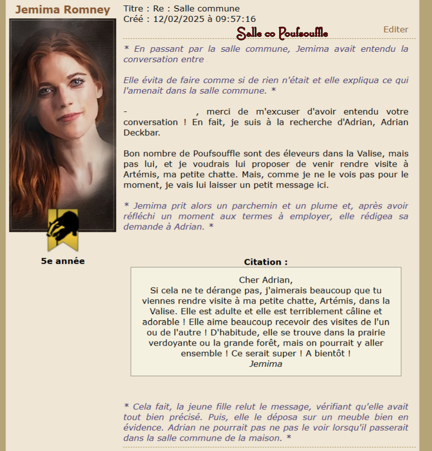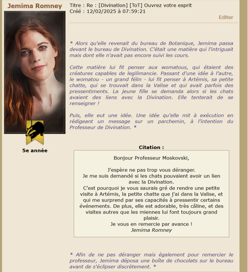 Avec ce défi, tu atteins aussi 40 défis validés sur 42, ce qui te permet de remporter 15 ticketts supplémentaires ainsi que 5 points de maison ! Ticketts distribués. PJ de Elyna Black![]() "On rencontre souvent sa destinée par les chemins qu'on prend pour l'éviter." Signature par Octavia Hargreeves <3 |