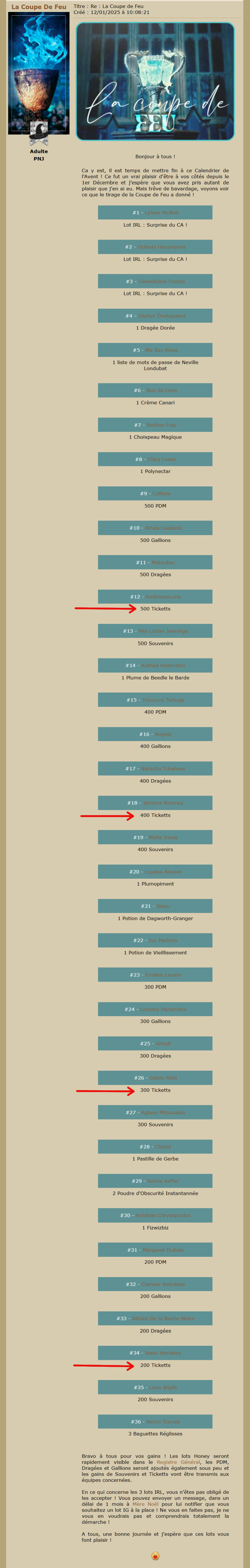 Edit au 25 février : Puisque ma fiche d'éleveuse est ouverte, merci de bien vouloir ajouter les 400 Ticketts gagnés lors de la loterie de la Coupe de Feu. Juste avant le tirage : 341 Ticketts Au 30 janvier : 341 Ticketts Au 25 février : 341 Ticketts Si le nombre de Ticketts qui apparaît ou apparaîtra au moment du traitement de ma commande est plus élevé que 341, ce sera probablement parce que j'ai effectué un grand nombre de défis qui auront été comptabilisés. Merci ![]() Commande traitée, merci. Fière marraine de Colin Vance