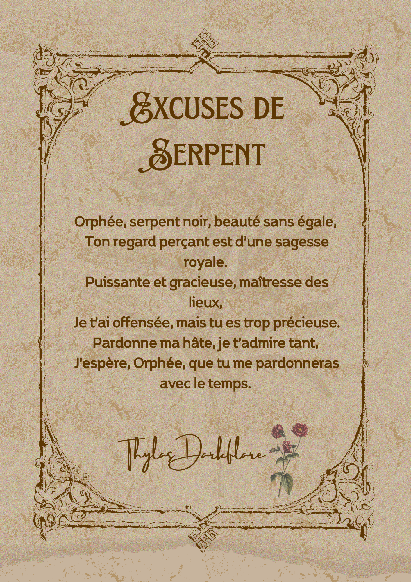 Spoiler : Poème Sans un mot, elle se dirigea lentement vers la sortie de la serre, laissant derrière elle son poème. La tension dans l'air était palpable, mais Thylas savait que pour l’instant, elle n’avait plus rien à dire ni à ajouter. Elle quitterait cet endroit en espérant que le poème suffirait à adoucir les conséquences de sa précipitation. |