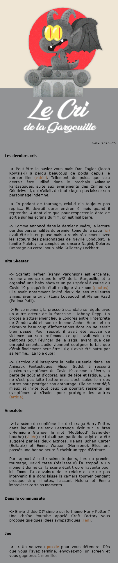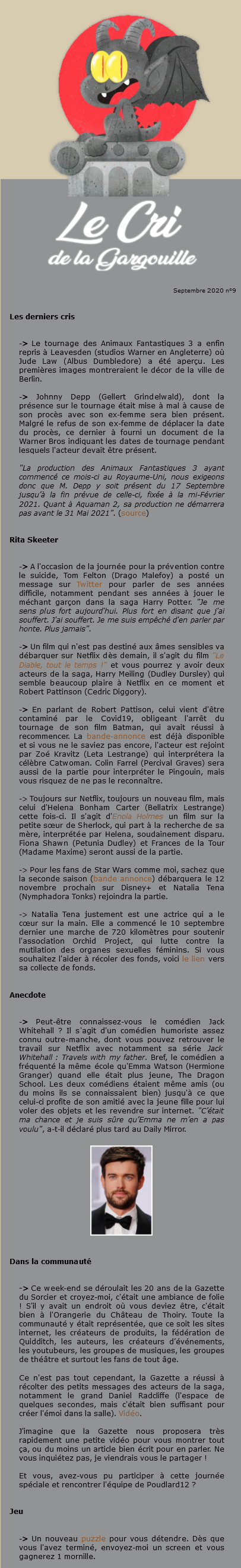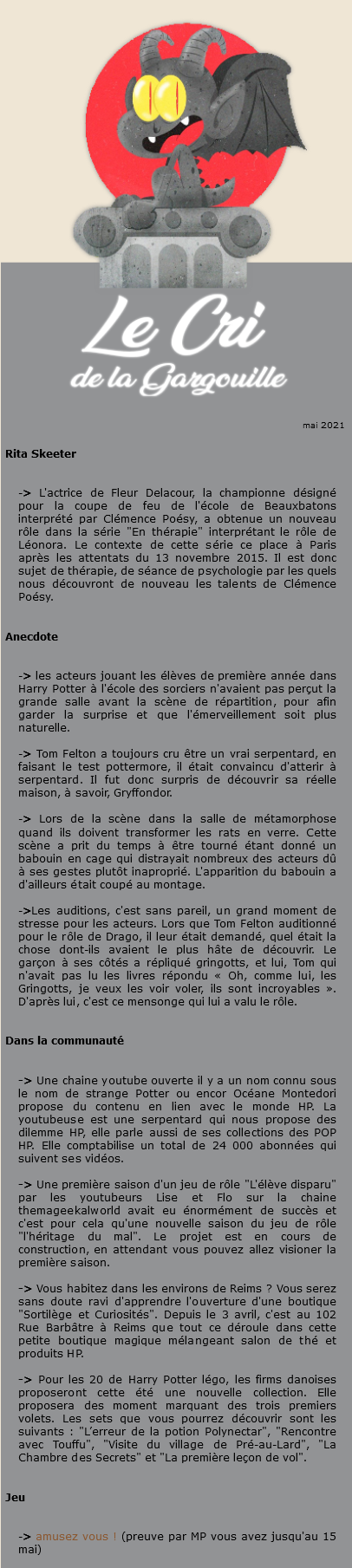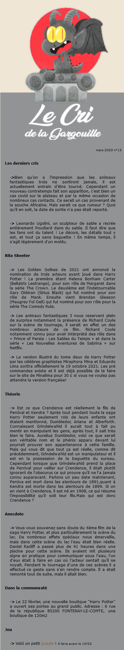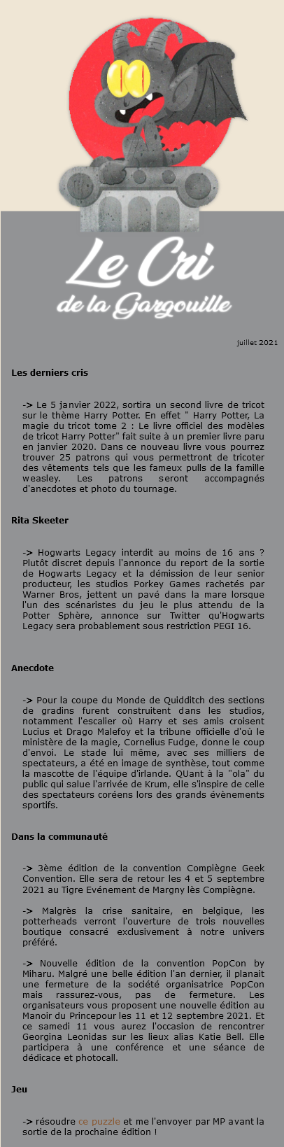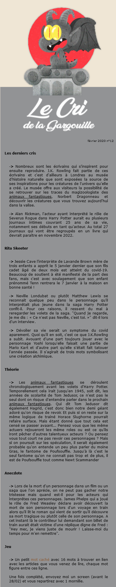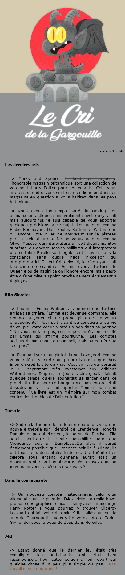 Je viens aujourd'hui vous présenter votre nouvelle source d'informations sur l'univers de J.K. Rowling, votre journal mensuel de la Communauté Magique Internationale, « Le Cri de la Gargouille » ! Ce journal existe depuis mai 2020, et après une longue pause, j'ai l'honneur de vous annoncer que le journal recommencera à paraître tous les mois pour votre plus grand bonheur, sur ce topic héhé.