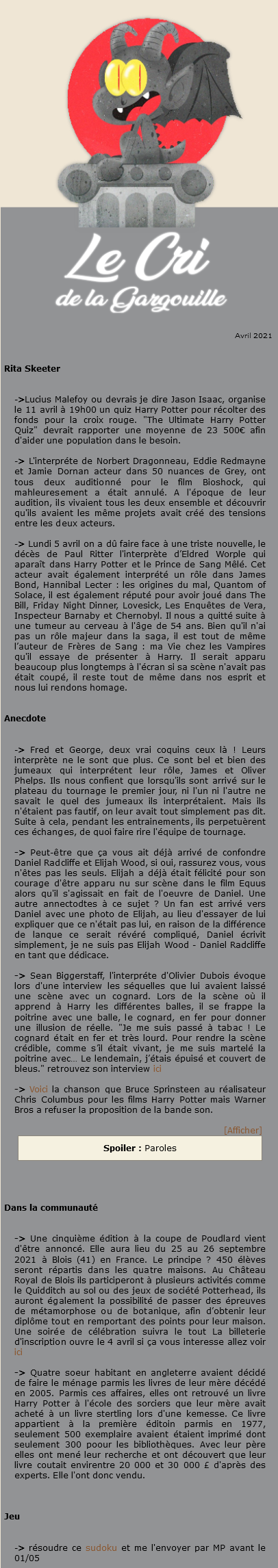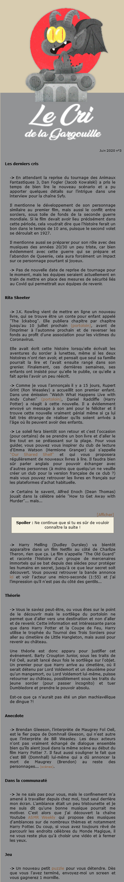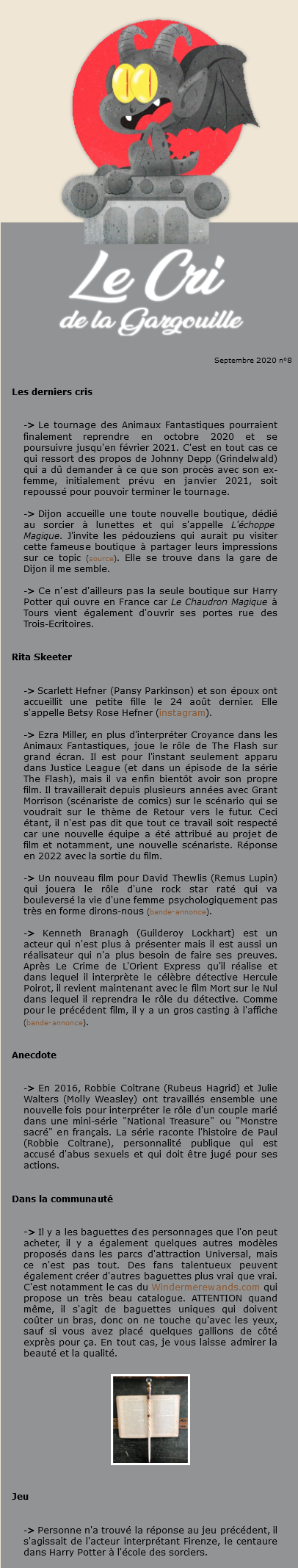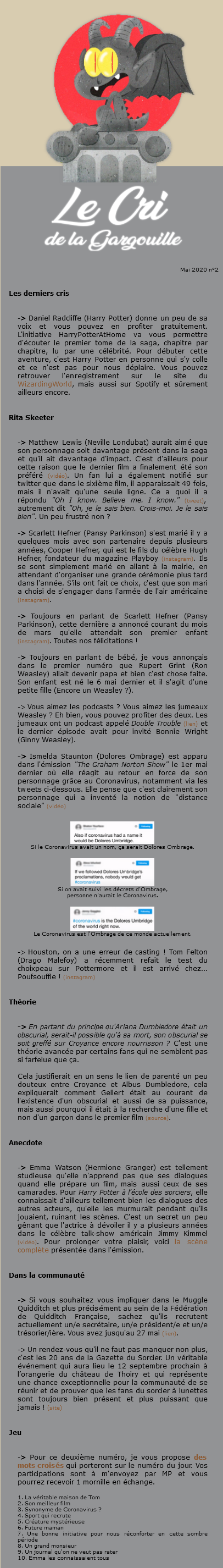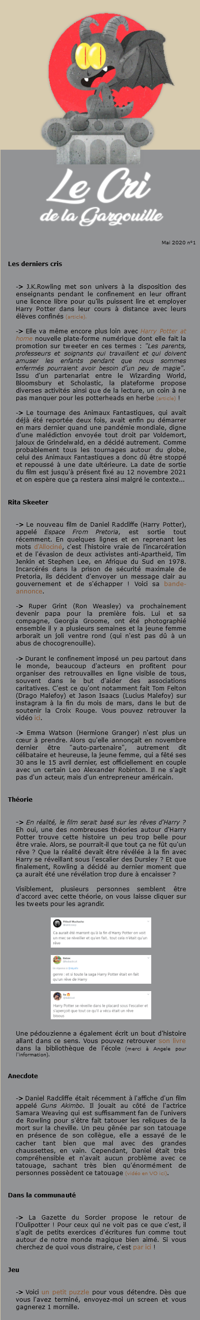 Je viens aujourd'hui vous présenter votre nouvelle source d'informations sur l'univers de J.K. Rowling, votre journal mensuel de la Communauté Magique Internationale, « Le Cri de la Gargouille » ! Ce journal existe depuis mai 2020, et après une longue pause, j'ai l'honneur de vous annoncer que le journal recommencera à paraître tous les mois pour votre plus grand bonheur, sur ce topic héhé.