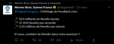 ► Chandler Wood, le community manager d'Avalanche Software qui travaille sur « Hogwarts Legacy : L'Héritage de Poudlard » a révélé des chiffres surprenants sur Twitter ! Le sortilèges Revelio est devenu l'arme ultime de beaucoup de joueurs pour percer les mystères du monde ouvert : chaque mètre parcouru dans le jeu vous oblige à lancer Revelio pour trouver des trésors dissimulés par centaines sur la carte. Mais rassurez-vous, vous êtes loin d'être seul à spammer votre bouton Revelio et cette mécanique quelque peu abusive a d'ailleurs été tournée en dérision par les internautes. Sur Twitter, Chandler a partagé des statistiques impressionnantes sur l'utilisation du sort par les joueurs depuis la sortie du jeu. Plus d'un milliard de Revelio lancés dans le monde, 37 000 Revelio lancés chaque seconde, soit plus de deux millions Revelio par minute. Le jeu, c'est aussi plus de 400 millions d'heures jouées, 674 millions de plantes cultivées, 405 millions de potions préparées et 2,25 milliards de mages noirs vaincus. Ces chiffres me donnent le tournis, pas vous ?