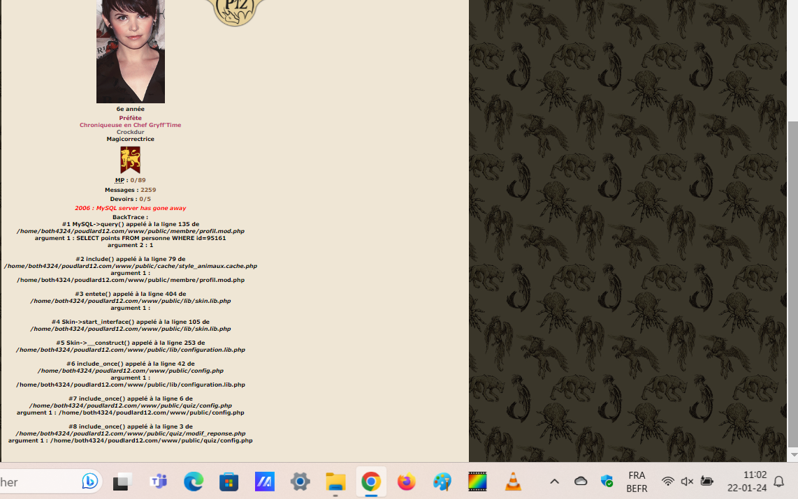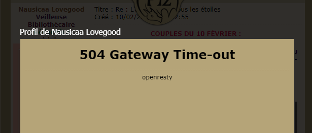 Comme mes cher.es VDD, j'ai eu aussi beaucoup de ralentissements aujourd'hui, pour me connecter, prévisualiser un post ou même pour regarder un profil... C'est la première fois que j'en ai autant eu. Je pensais que c'était à cause de ma manie d'ouvrir 30 onglets à la fois (aa), mais ça ne fait cela que avec poudlard12 et le site de la gazette du sorcier, et ça affiche parfois le même message que Violette et Ambrosia, Error 503 (pas de captures désolée) Je ne sais pas si ça peut vraiment aider... Bonne soirée