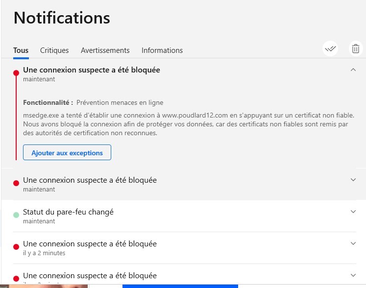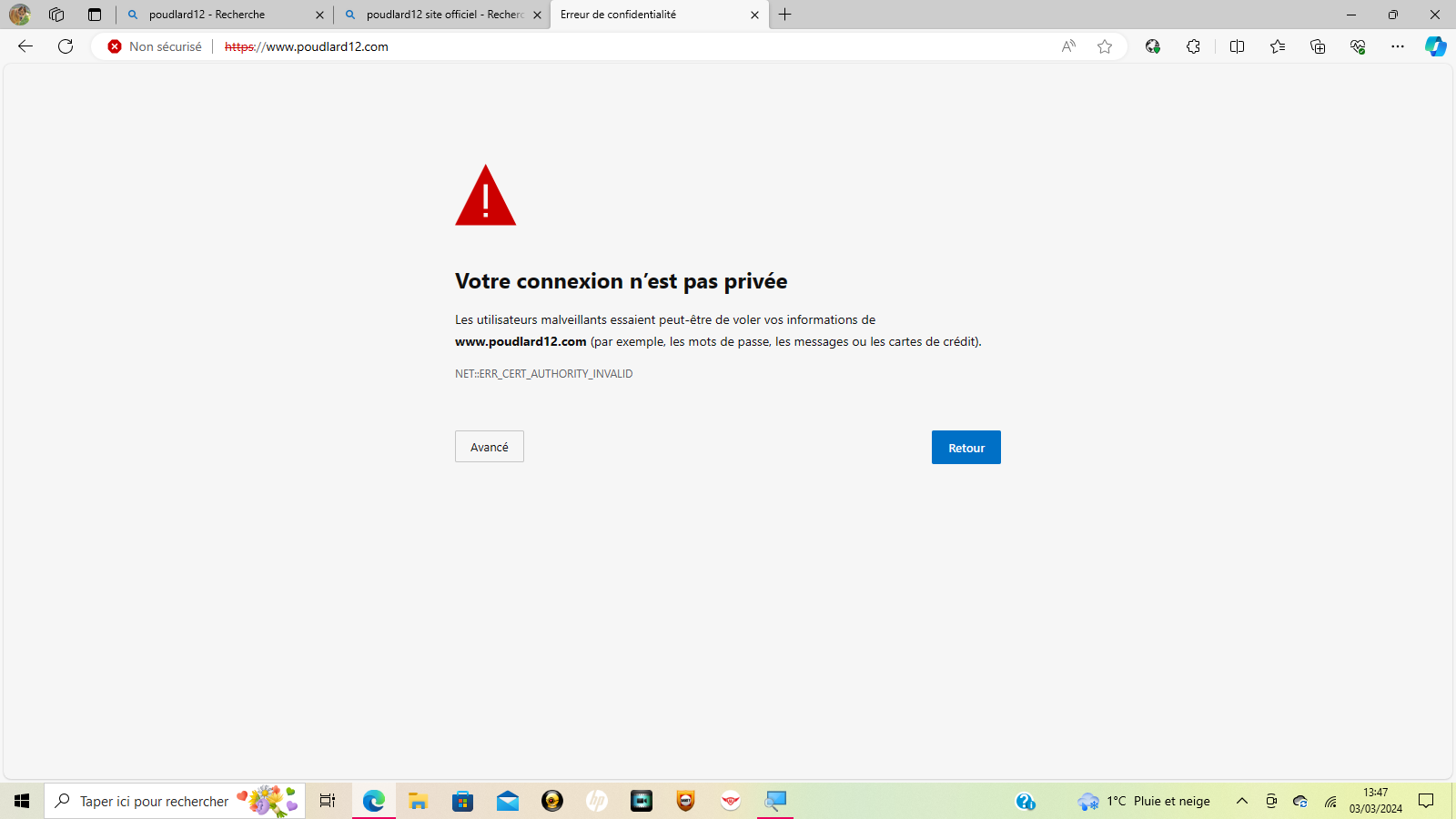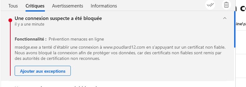 perso ça n'a pas rétabli, je suis passée outre les hurlements de mon anti virus Bit Defender !! Je ne suis pas tranquille du coup , j'ai eu ça ![]() ![]() J'ai éteint et rallumé trois ou quatre fois sans changement, et là j'ai forcé mais bon ... Julien lui avait "votre connexion n'est pas privée" Merci à toi de me dire si je dois faire quelque chose. |