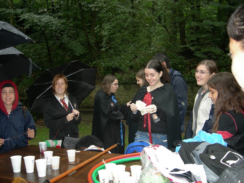 Kestrel, annonce les équipes tandis que Noémie distribue capes et baguettes aux sorciers présents. Symbole des maisons de Poudlard, les 3 équipes sont tout simplement les maisons de Poudlard : Serdaigle, Gryffondor, et Poufsouffle/Serpentard unis en raison du petit nombre de présents dans chacune d'elle deux.