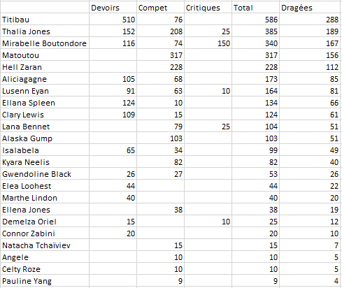 ![]() Titibau Meilleur pointeur avec 510 points ![]() Matoutou Meilleure compétitrice avec 317 points ![]() Mirabelle Boutondore Meilleure critique avec 30 critiques Félicitations à vous trois ! Vous entrez une fois de plus au Panthéon de Serdaigle ! Les plus assidus le savent, ce post est également l'occasion de revenir sur le titre tant attendu de Serdaigle de la Coupe. Cette fois-ci, notre regard s'est porté sur une membre hyperactive de notre maison. Elle a tout d'une Serdaigle, s'implique dans les moindres recoins du Château, est toujours présente pour aider ses camarades ou même papoter, et a remporté l'animation de l'été. Vous aurez bien entendu reconnu Ellena Jones, qui en plus de remporter 50 dragées supplémentaires, gagne son ticket pour le Club de Slug ! Bravo ! ![]() Ellena Jones Serdaigle de la Coupe Félicitations ! ICI, retrouvez en détail les participations de chacun et les récompenses en dragées associées. |